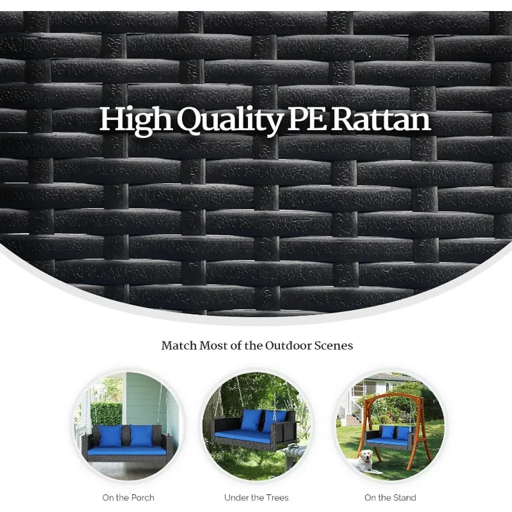 Vingli Heavy Duty 800 Lbs Wicker Hanging Porch Swing With Cushions & Chains, 4Ft Outdoor Rattan Swing Bench For Garden, Yard, Lawn (Black+blue)
