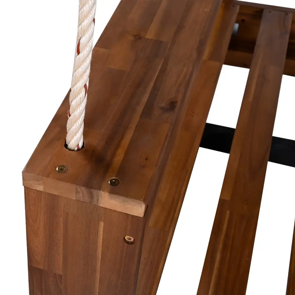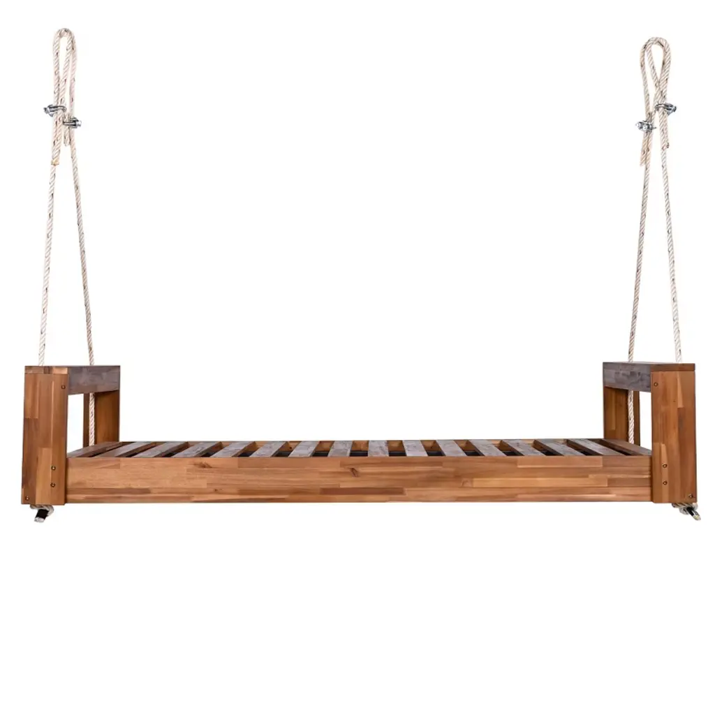 This Twin Size Porch Swing Bed combines rustic charm with outdoor durability, crafted from premium acacia wood with natural weather resistance. The spacious 75"x39" frame accommodates a standard twin mattress (sold separately) for ultimate relaxation. Four 98-inch hemp ropes with heavy-duty clips provide secure suspension (400lb capacity), creating a gentle swing motion perfect for napping or reading. The minimalist slatted design allows airflow while complementing patio, garden or porch decor. Includes all necessary hanging hardware for easy installation. With its UV-resistant finish and sturdy construction, this swing bed offers year-round comfort in any outdoor setting.