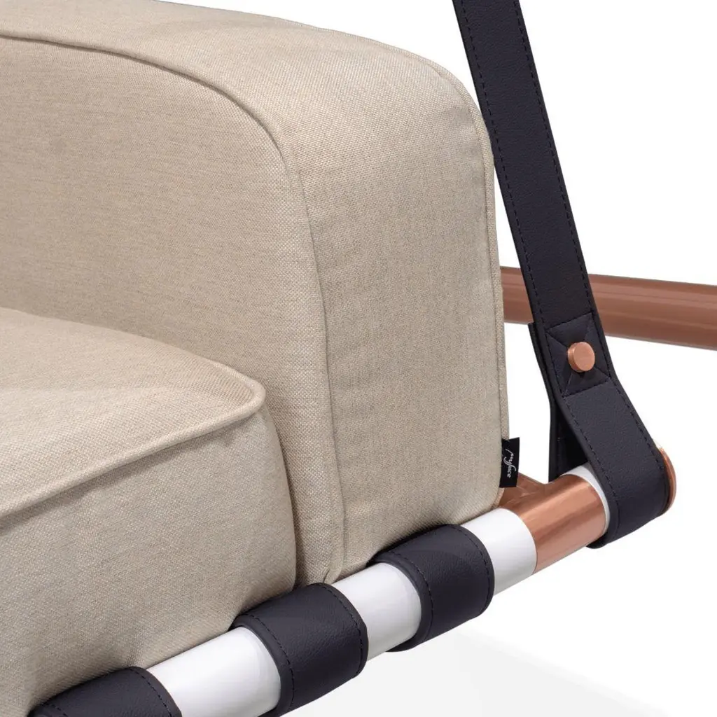 Fable Outdoor Swing armchairInspired by the simplicity of childhood swings, it is the perfect place to relax and relive cherished memories.Crafted with durable and resilient materials, the Fable swing is designed to withstand the demands of outdoor use, looking brand new over the years. Its soft, padded seat offers superior comfort, while its sleek and elegant design brings a sense of lightness and timeless sophistication.The whole design of this sophisticated outdoor swing was developed according to the following structure: -Structure: White matte lacquered stainless steel;-Metallic details: copper-plated stainless steel;-Upholstery: green acrylic fabric;-Straps: brown outdoor leatherAll Myface materials are from premium suppliers, engineered to offer the best performance possible outdoors.Water, Mold, Mildew, UV, and Fading resistance are some of the characteristics that you can expect from both materials, which are available in a wide array of colors and patterns.Hold by lacquered stainless steel and plated details joints, this inviting swing is available in a wide color array of weather-resistant synthetic leathers. Through a contemporary interpretation of the traditional childhood swing, Fable allows quality outdoor moments without any concerns.