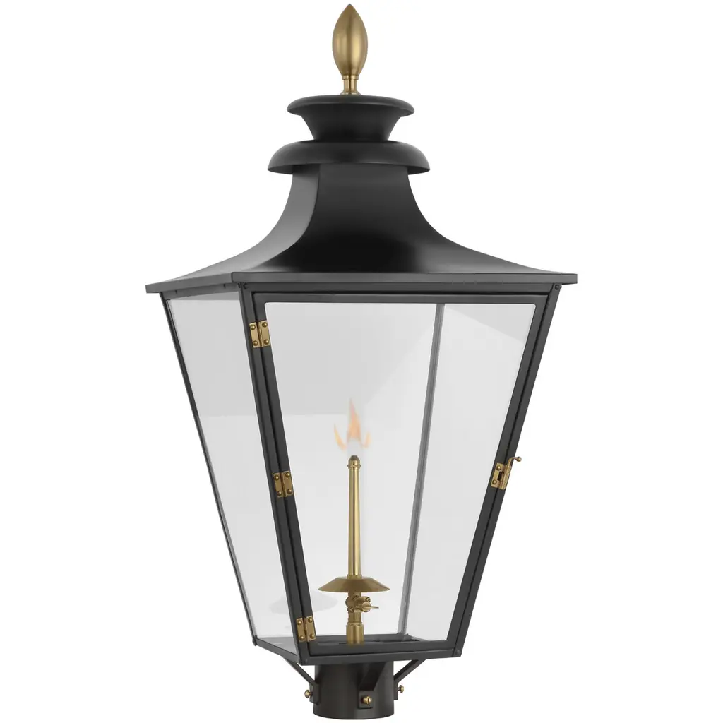 Visual Comfort Signature presents the Albermarle Outdoor Gas Post Light, designed by Chapman & Myers. This post light features a tiered roof that gracefully slopes into a tapered, lantern-style silhouette, creating a visually appealing design. Atop the roof, a metallic finial adds a touch of elegance. The glass panes of the luminary housing are framed with expertly crafted metalwork, showcasing exceptional craftsmanship and attention to detail. The contrasting hardware further enhances the visual appeal of the post light. Powered by natural gas, this light fixture creates a warm and inviting glow, perfect for illuminating your outdoor area.