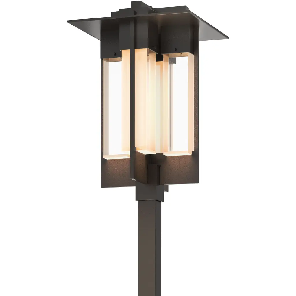 Light your way in grand style. Four handcrafted aluminum bars rise up and around to secure the glass of their large Axis Outdoor Post Light. A metal top plate and banding complete the sophisticated look. 4-light outdoor post light with clear glass and finish options. Features a square collar for use with 2.5" square posts. Post, pier mount, and cover cap sold separately. Features