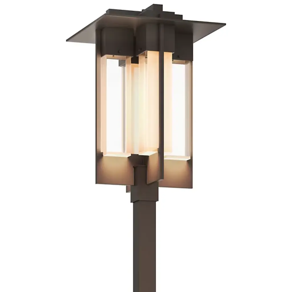 Step up your curb appeal with the Axis Outdoor Post Light from Hubbardton Forge. Refined and sophisticated, this fixture features 4 rectangular glass shades each surrounded by sturdy Aluminum accents. A metal top plate brings the elements together, creating a cohesive look. UL Listed Wet with coastal finishes and suitable for every environment. Each piece is handcrafted in Vermont by skilled artisans.