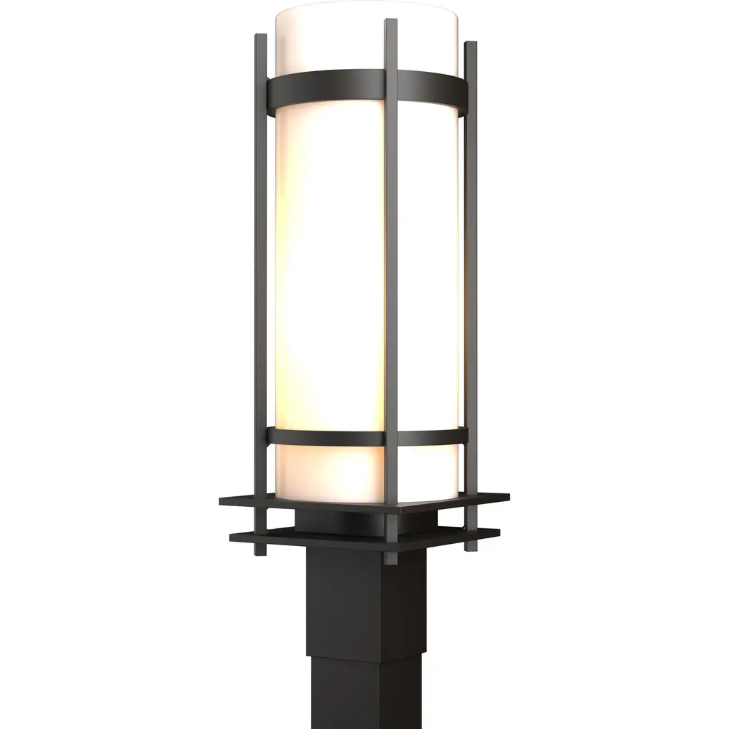 A strong outdoor luminaire that infuses a contemporary flair. The Banded Coastal Outdoor Post Light by Hubbardton Forge brings optimal illumination to your landscape. Its cylindrical shade made of glass is protected with a strong frame composed of horizontal aluminum bars and two handcrafted slender metal bars. This geometrical structure is mounted onto the double square collar and installed to ground with a tall square post. The coastal finish makes this fixture resistant to harsh outdoor elements.