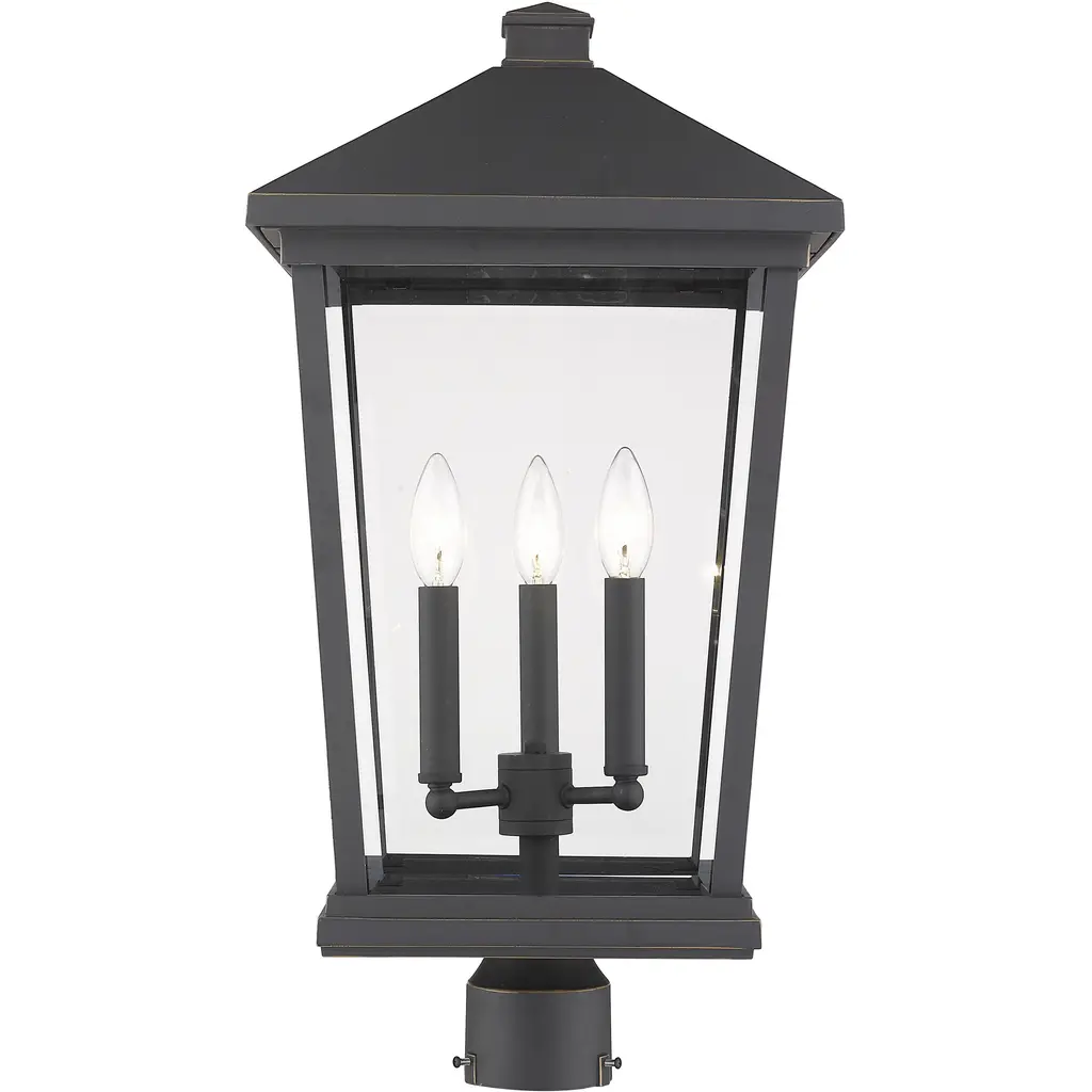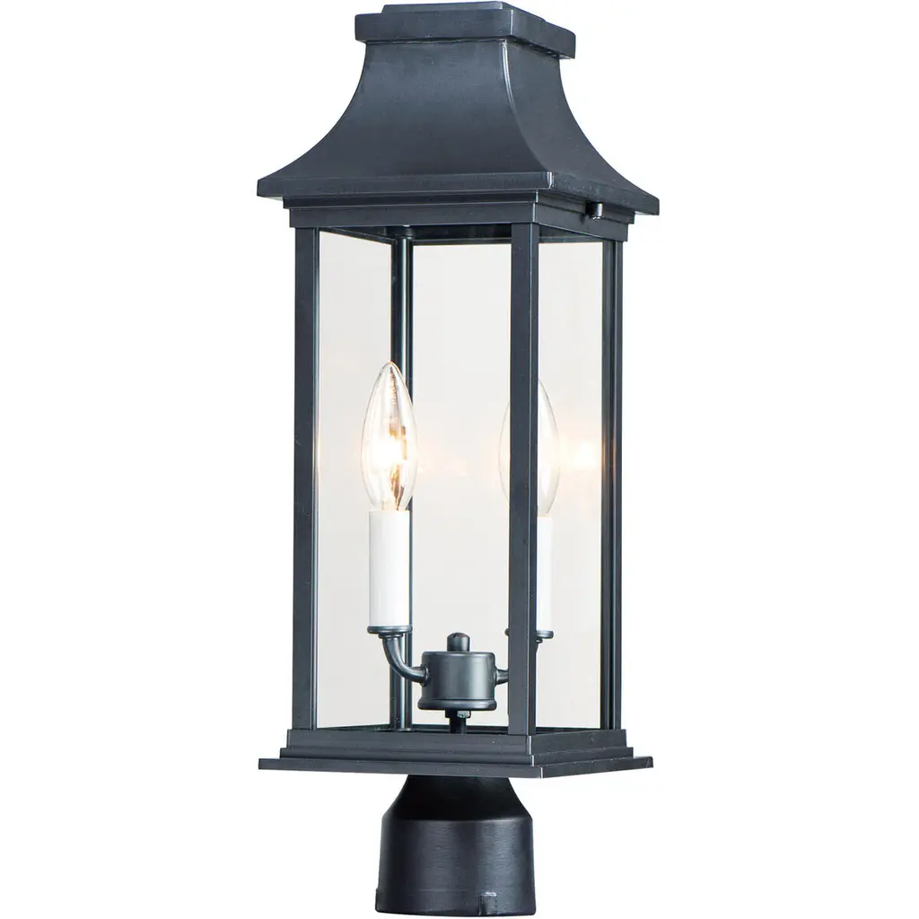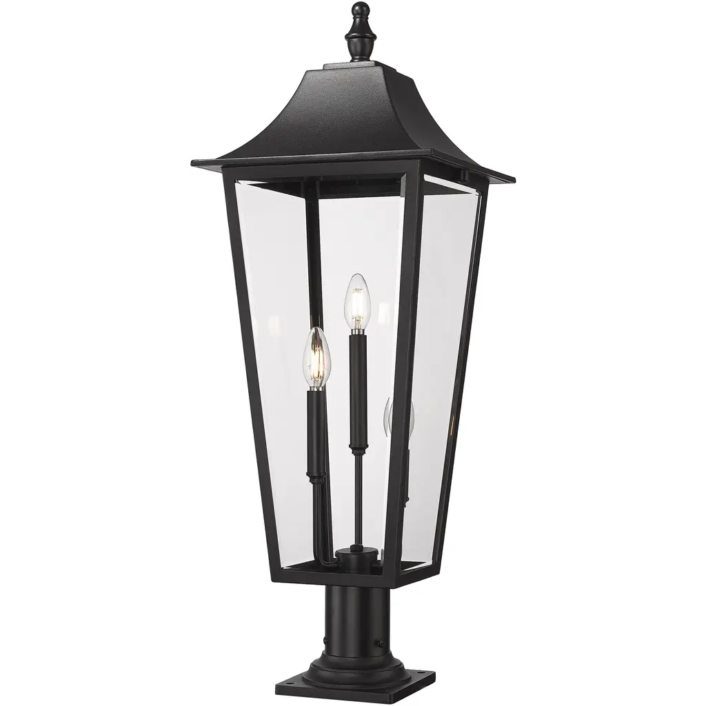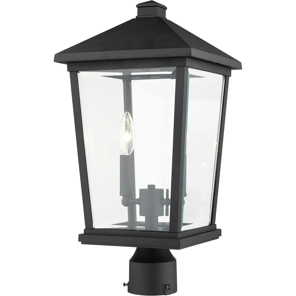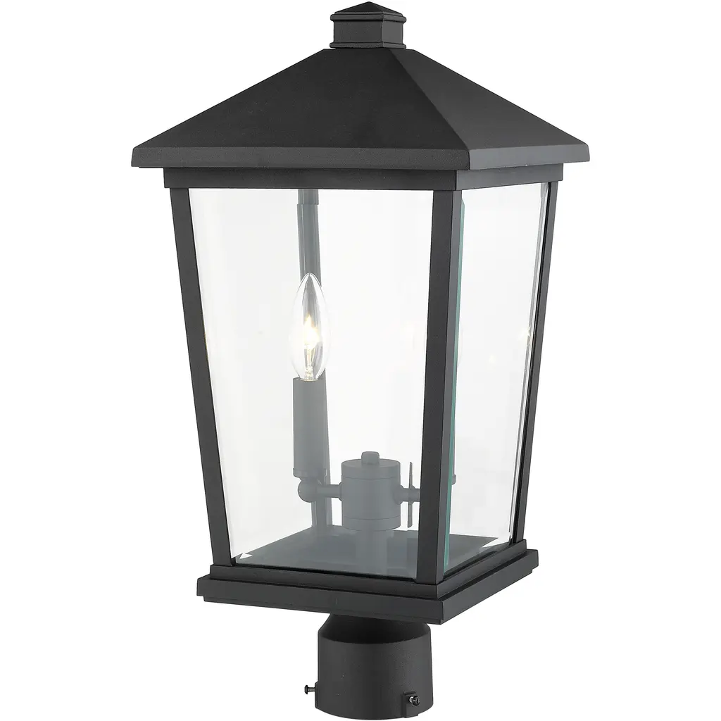 This charming outdoor post lantern shows off a custom designed exterior walkway or garden space. Soak up the nostalgic appeal of a village theme with a black finish frame, clear beveled glass panels, and sweet candelabra-style bulb bases inside.
