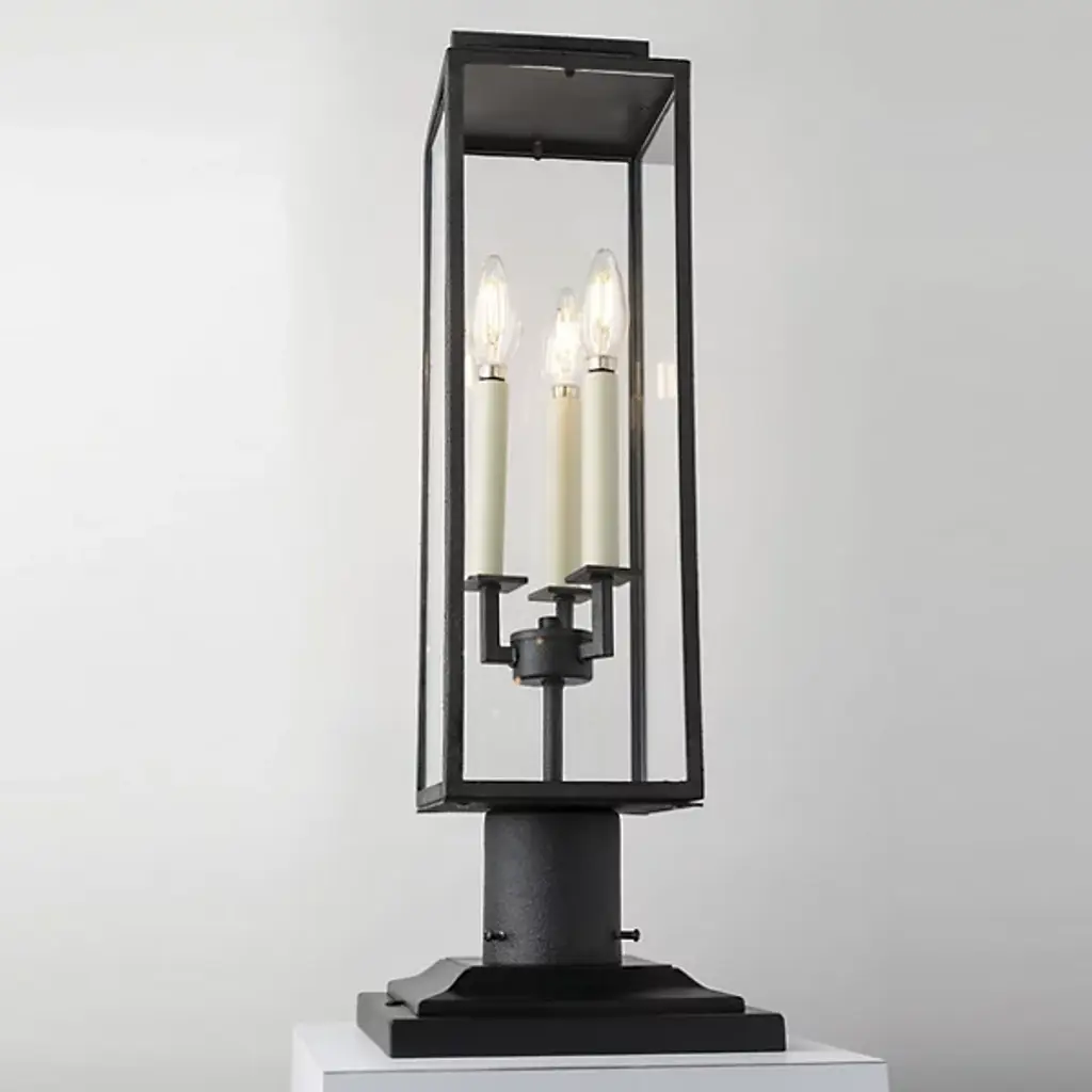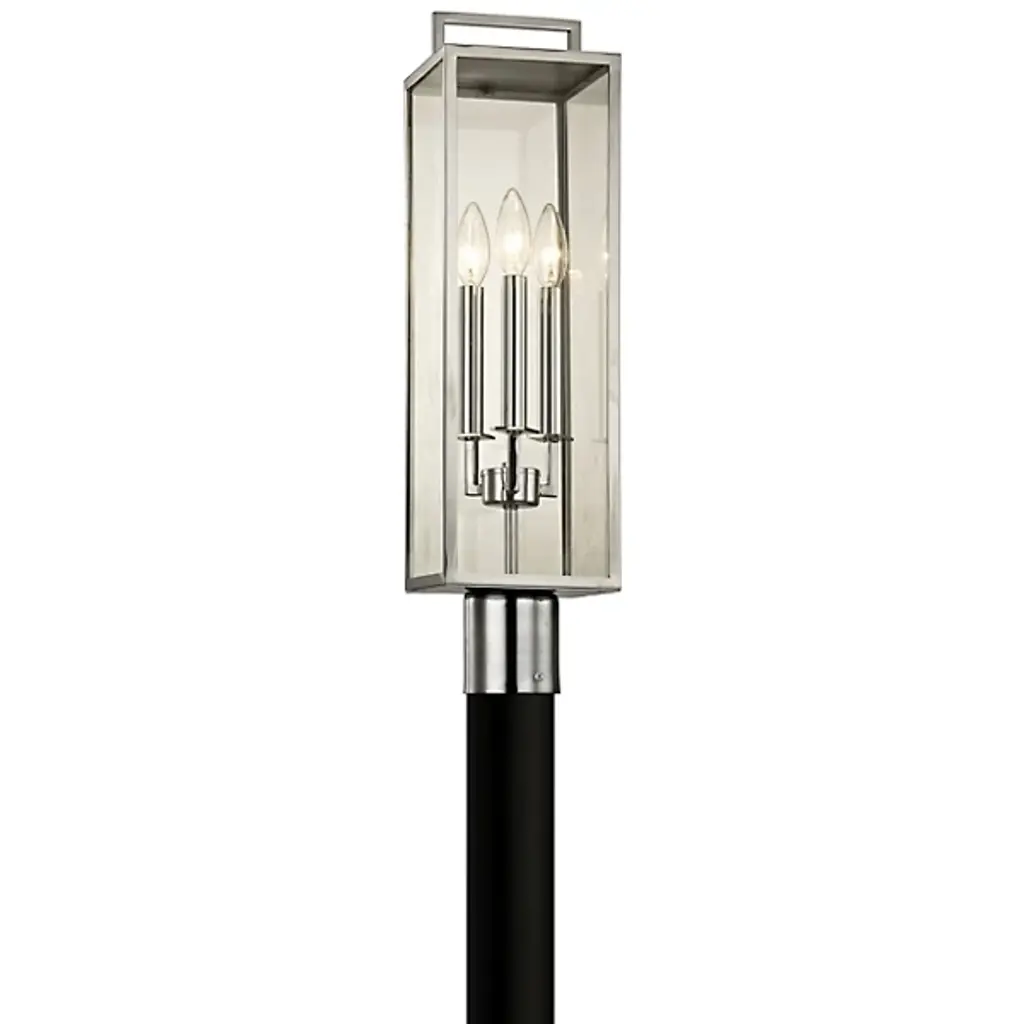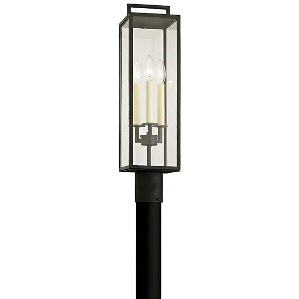 A striking departure from the post lighting of yesteryear, the Beckham Outdoor Light Post by Troy Lighting uses modern touches to create a composition that's pragmatic and architectural as it is stylish. Built around a Cast Metal frame, it's squared and angled aesthetic uses Clear Glass panes to accentuate its open lantern look. The post mounted fixture is mounted with an accent top loop that's squared to finish the look.