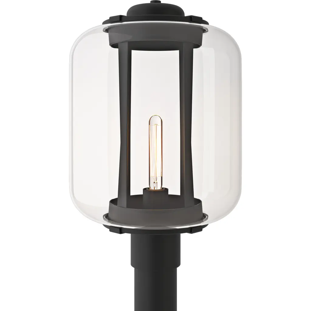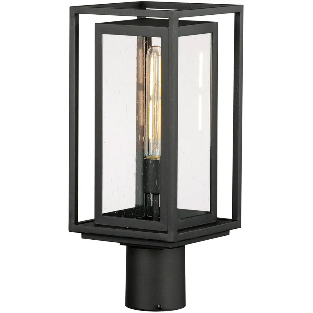 An open, handsome addition to outdoor paths or patios. The Besita Post Light from Huxe rises from a trim post mount. The post light seats a wet-listed vintage lamp inside an open rectangular frame defined by a shallow bracket rising from between the lamping. The thick, clear glass shade reduces the bright glare to a pleasant glow. Robust iron hardware protects the glass while adding an angular contrast to the shade's smooth curves.