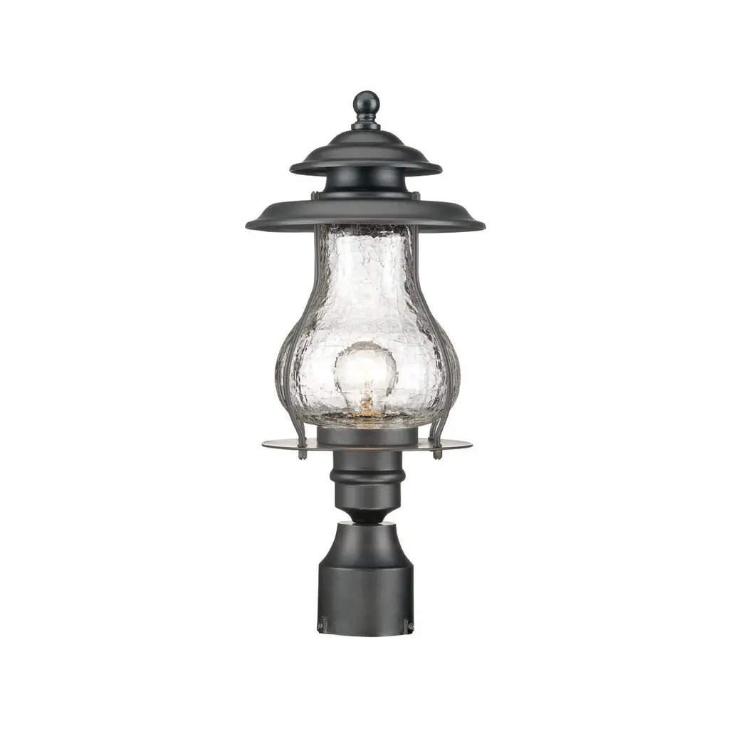 The Blue Ridge collection evokes memories of gas coach lanterns of yesteryear. The chimney shaped, clear crackled glass shade adds mountain charm. Constructed of powder-coated steel to withstand the elements.