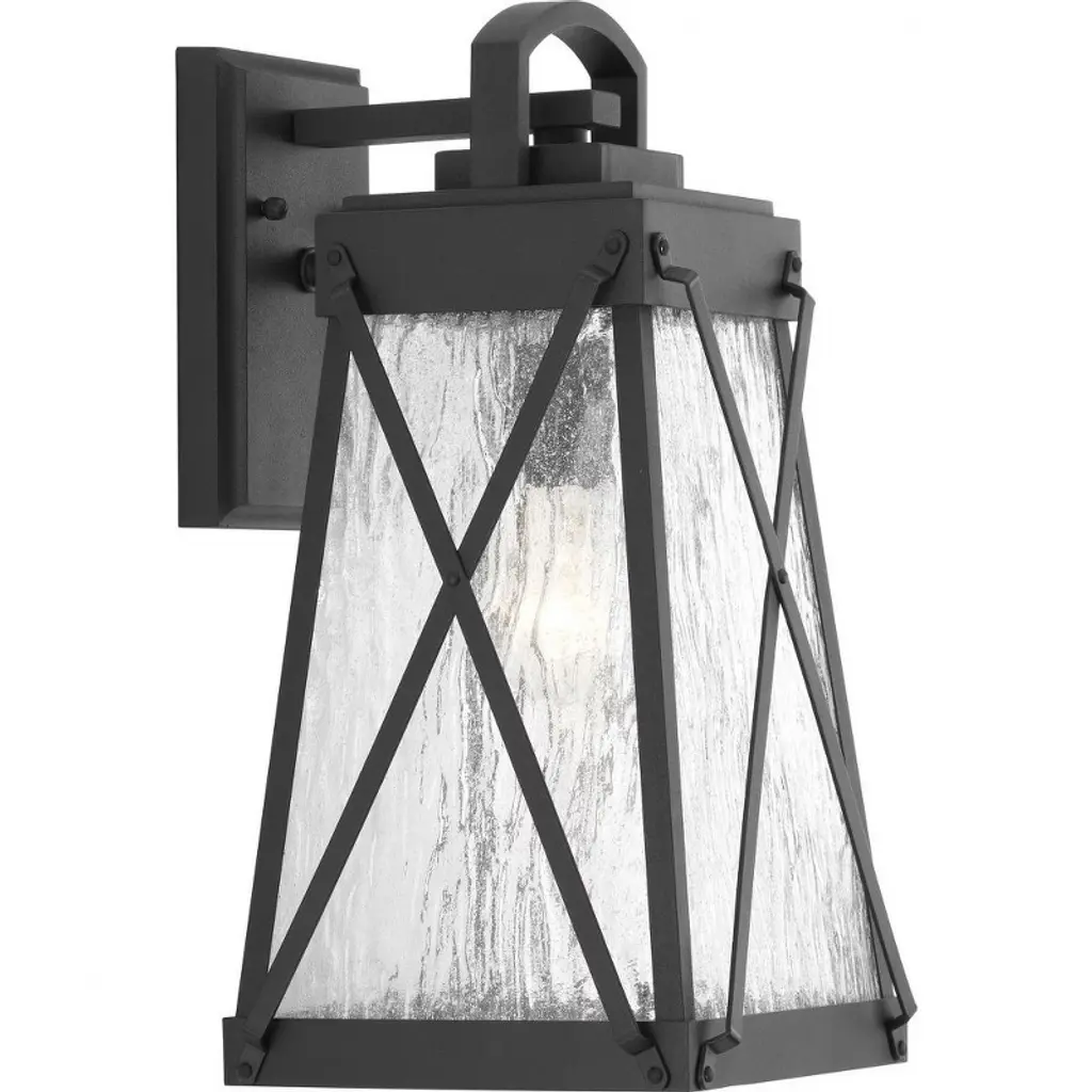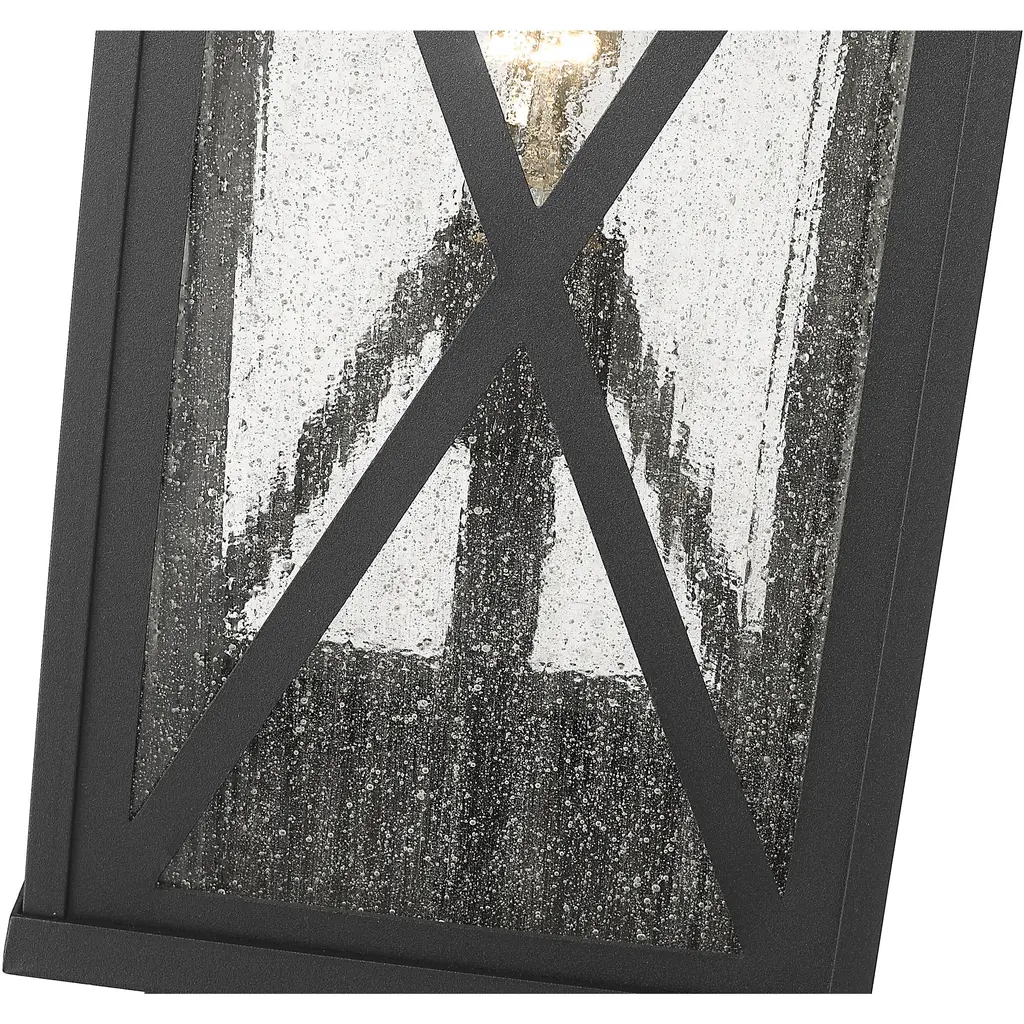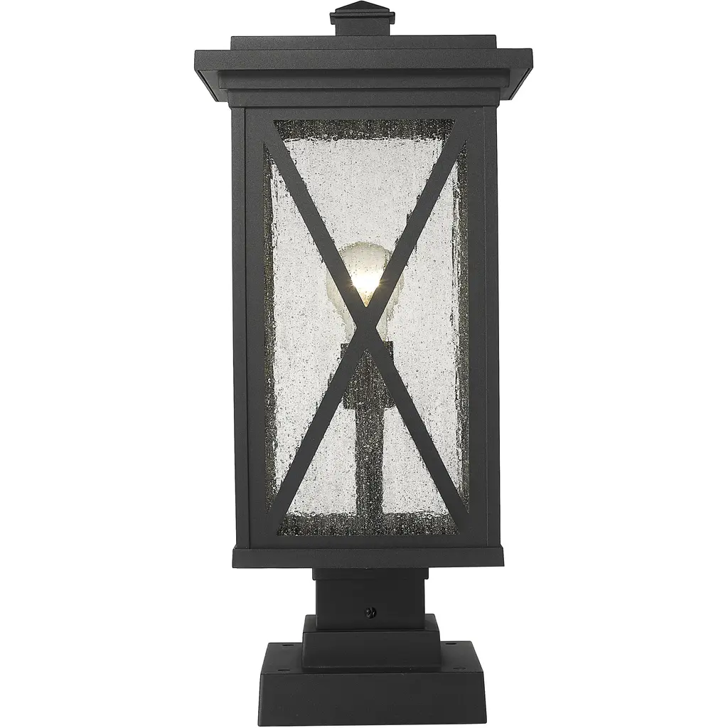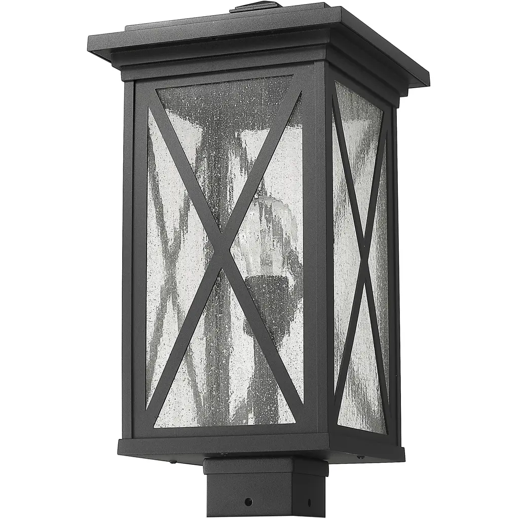 This one-light outdoor post mounted fixture comes in a box-shaped black aluminum cage with a clear seedy glass finish. It softly diffuses light to provide a welcoming glow to your front entrance or patio. Compelling X-accents bring dimension and character.