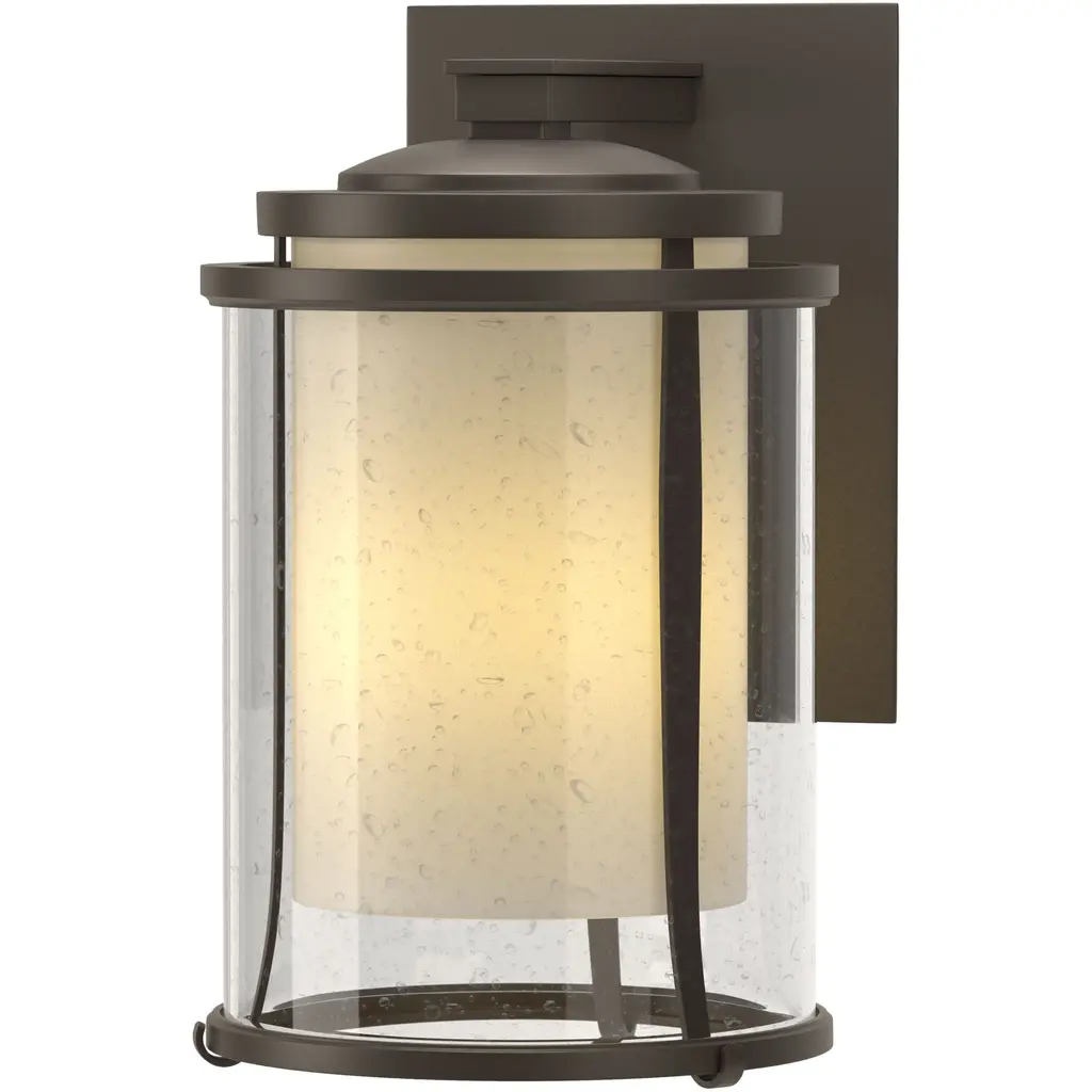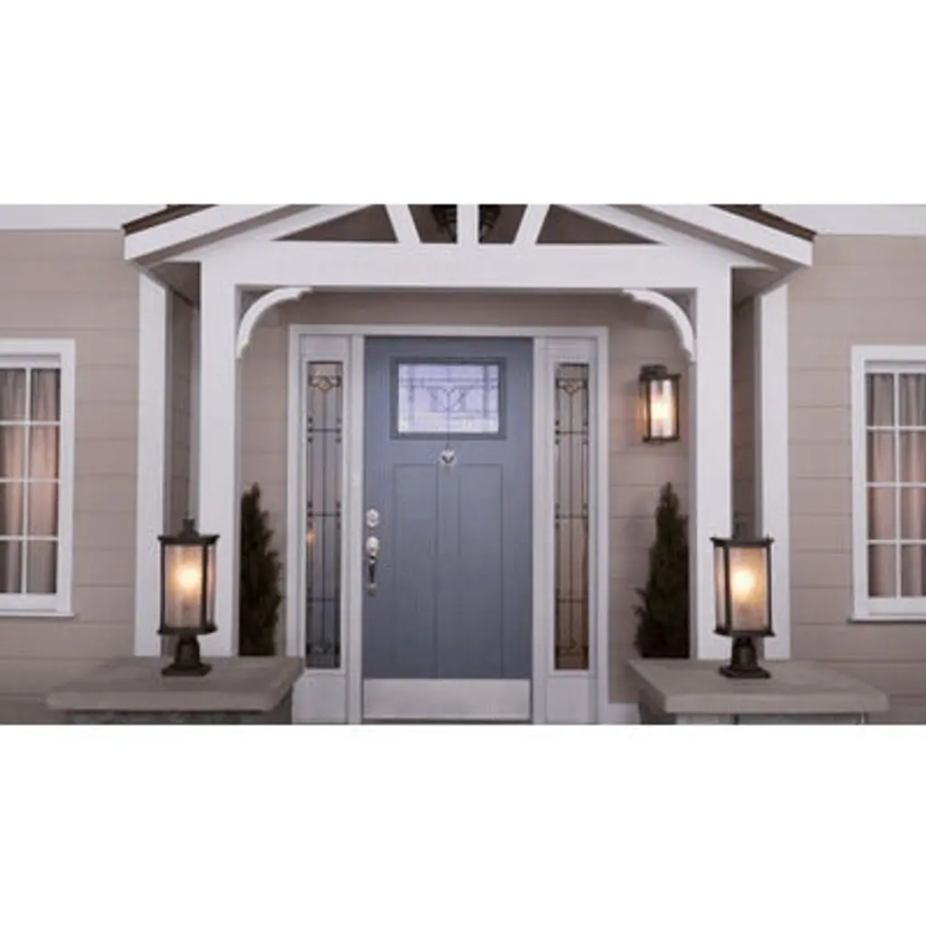 The craftsman inspired Bungalow outdoor cast aluminum collection is finished in Bronze. The exterior Seedy glass adds texture while the interior Wilshire glass adds warmth. Bungalow is also available with energy-efficient fluorescent light in the Bungalow EE collection.