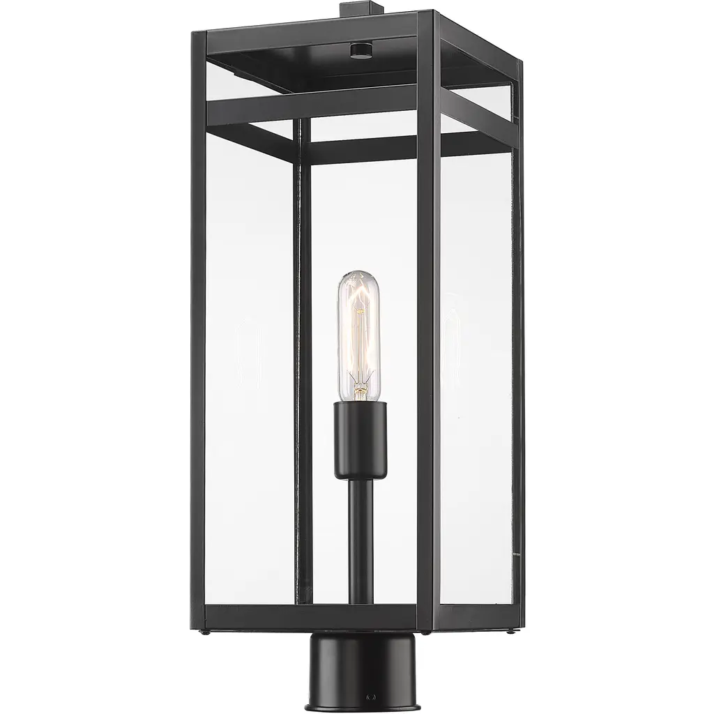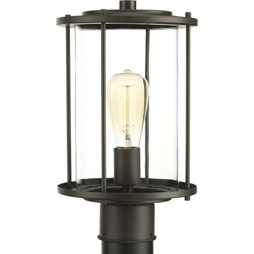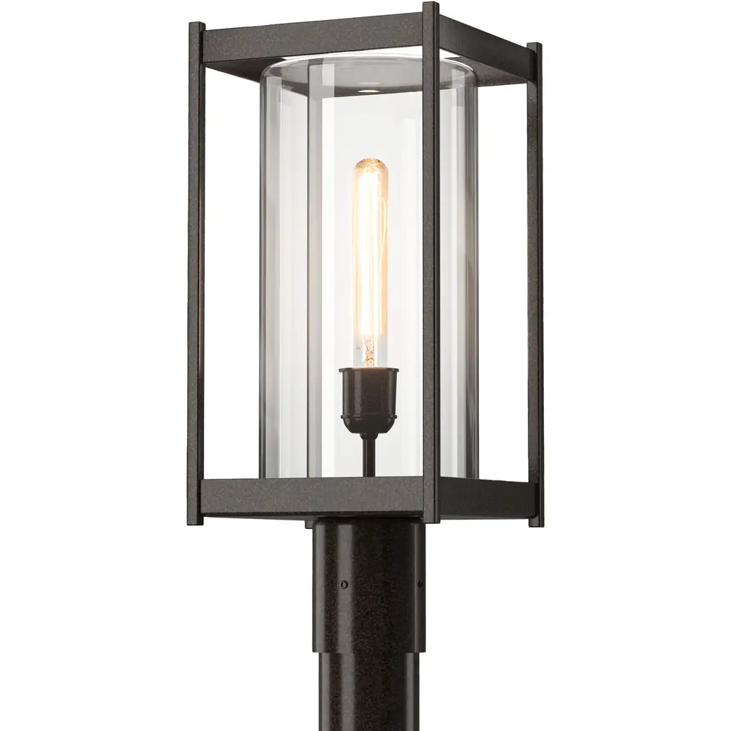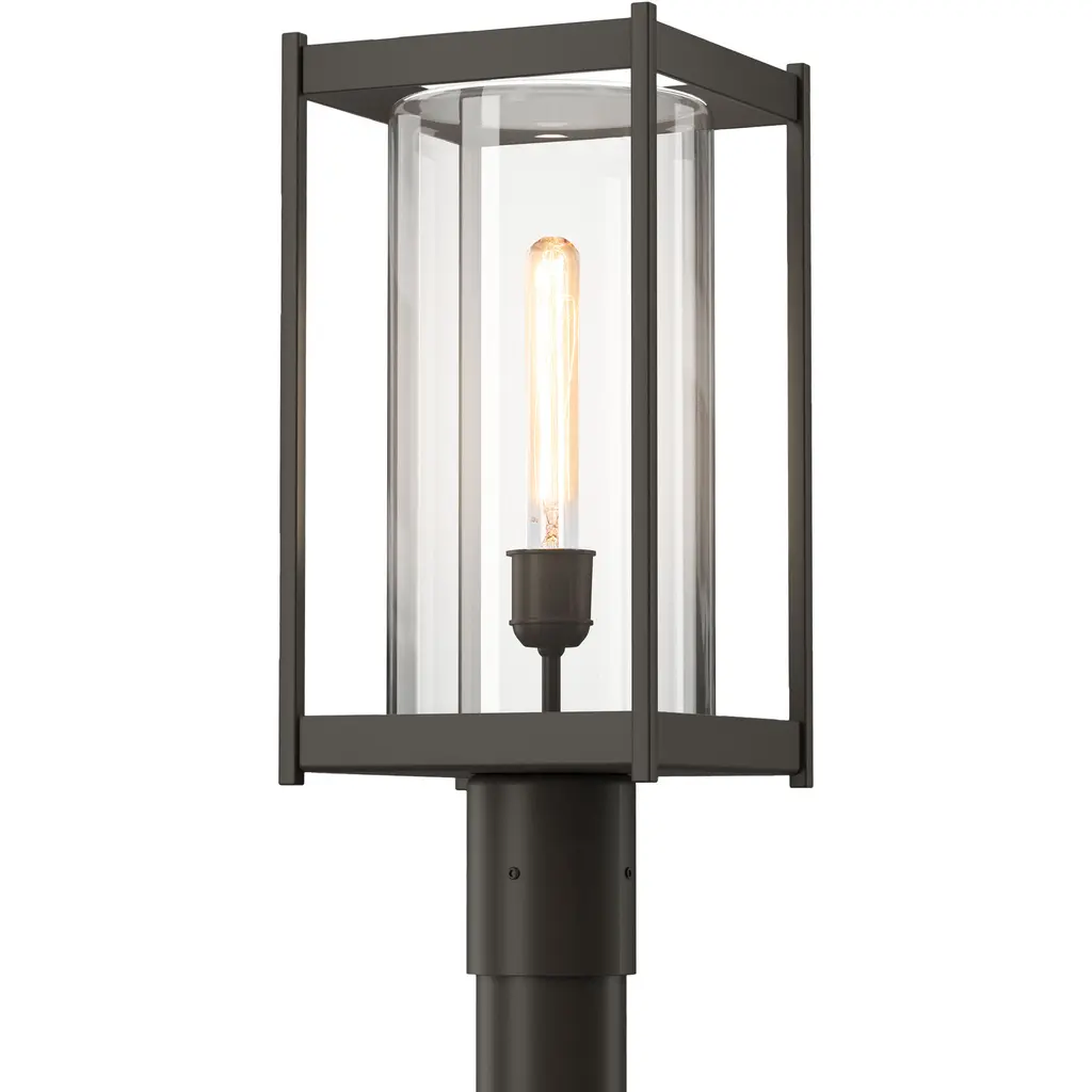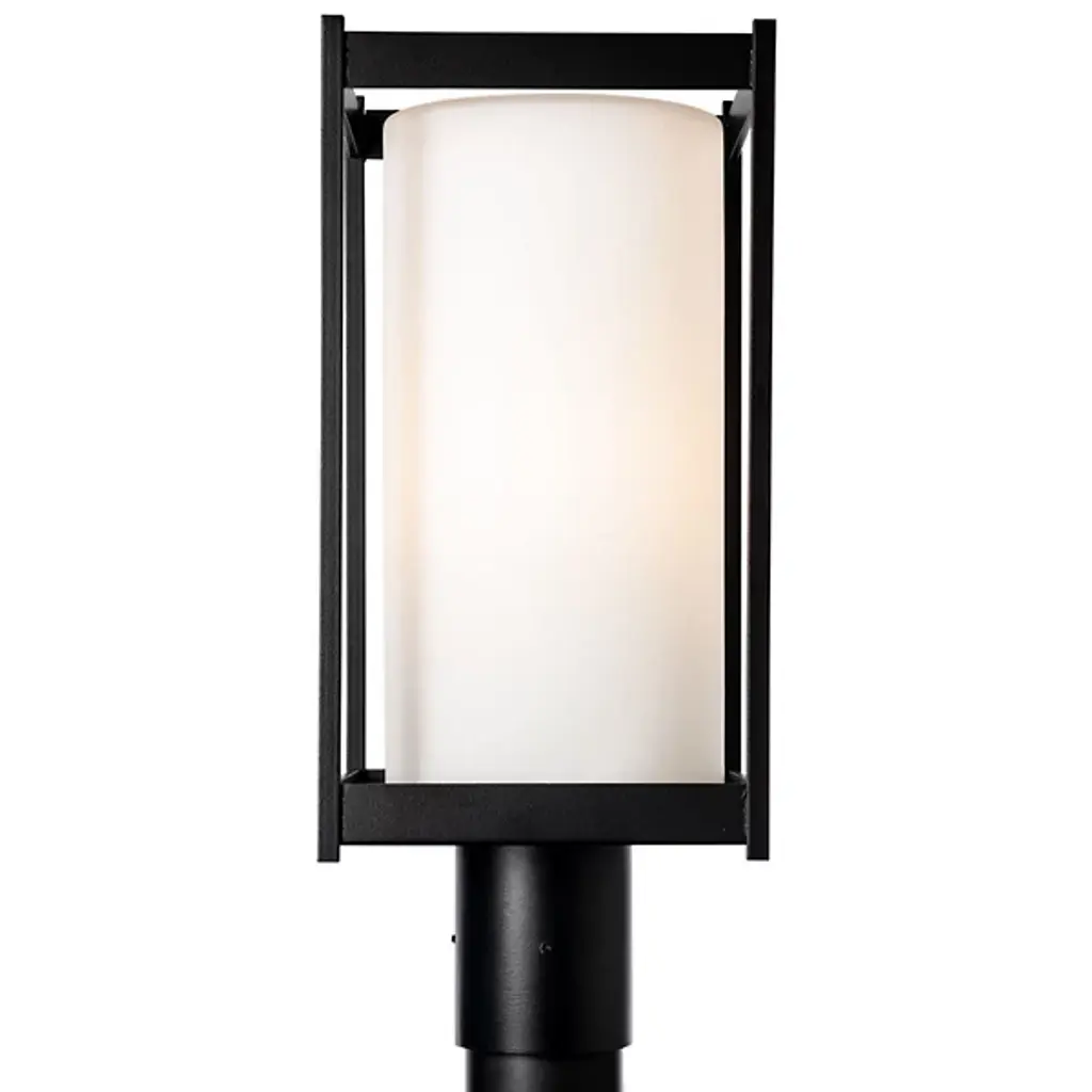 The distinctive, yet still familiar, sentinel you need at the end of a driveway or footpath. The Cela Outdoor Post Light by Hubbardton Forge was designed by Paul Marr-Hilliard as a modern interpretation of traditional lantern lighting. An open aluminum cage suggests the classic vertical profile of a lantern as it surrounds a large cylindrical glass shade. The watertight shade protects the lightbulb inside and helps to disperse its light brightly all around. Post sold separately.