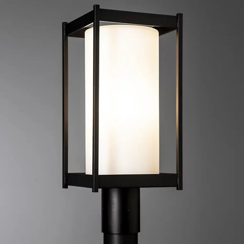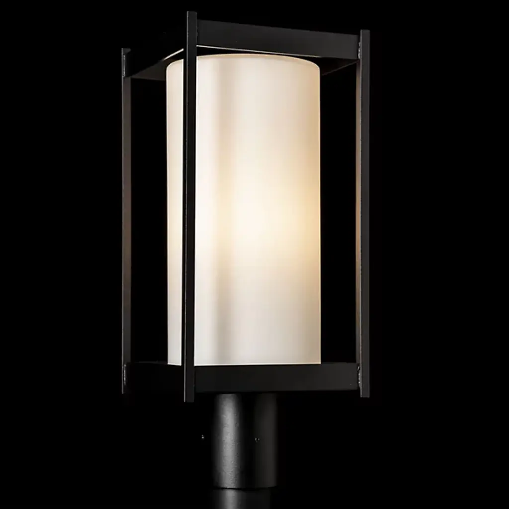 The distinctive, yet still familiar, sentinel you need at the end of a driveway or footpath. The Cela Outdoor Post Light by Hubbardton Forge was designed by Paul Marr-Hilliard as a modern interpretation of traditional lantern lighting. An open aluminum cage suggests the classic vertical profile of a lantern as it surrounds a large cylindrical glass shade. The watertight shade protects the lightbulb inside and helps to disperse its light brightly all around. Post sold separately.