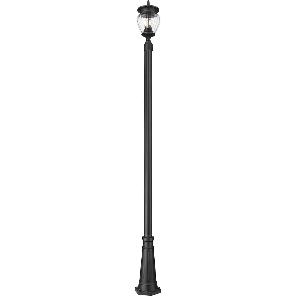 This glam-inspired three-light outdoor post-mounted fixture elevates a front or back yard in perfect style. Wonderful for delivering an alluring look with dimmable lighting in gardens and along walkways, this slender fixture is a chic design featuring an aluminum post and light frame with a Coastal black paint finish over aluminum. Ribbed teardrop glass pairs with a candelabra bulb mount to create an intricate silhouette complemented with a tapered post design.