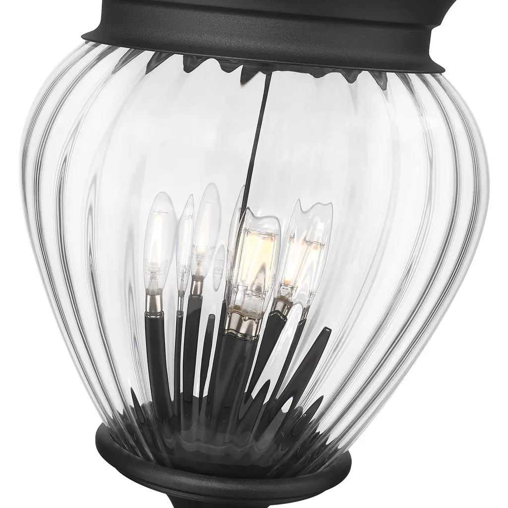 Exceptional artisan flavor turns an exterior fixture into a primary decor piece suited for a sophisticated yard setting. This four-light outdoor post-mounted fixture is a complete unit features a clear ribbed glass shade that filters light and creates rich dimensionality. With a smooth Coastal black paint finish, its dramatic impact is softened with a romantic gallery style.