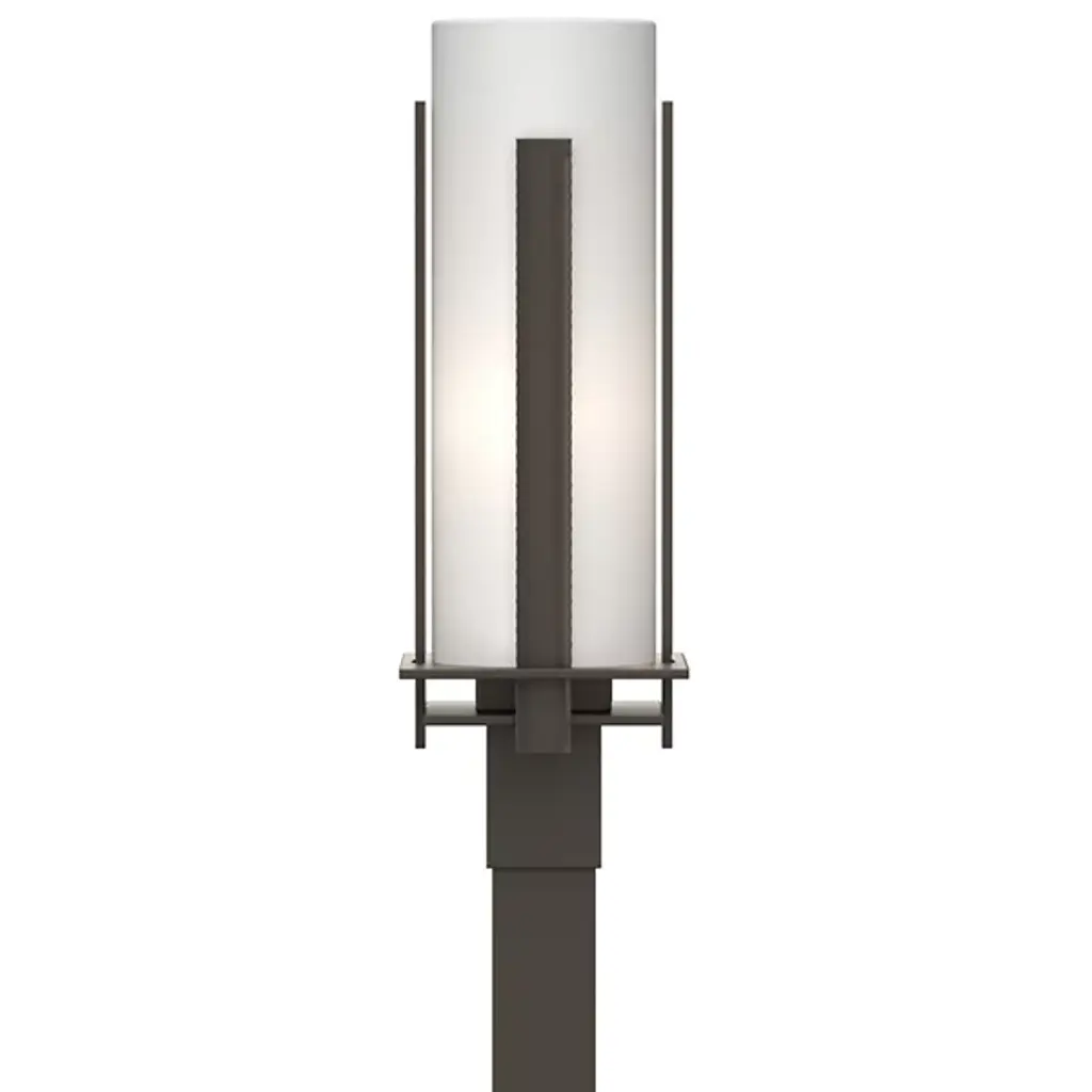 A striking combination of shapes and materials. The Forged Vertical Bars Coastal Outdoor Postmount by Hubbardton Forge is a bold and sophisticated addition to gardens, backyards, and pathways. It presents an elegant frame with a double square plate at the bottom and is installed to the ground with a long, slender post. Housed within the frame is a cylindrical shade made of opaque glass. It is hand-forged from aluminum with a coastal finish to ensure durability and withstand harsh weather elements.