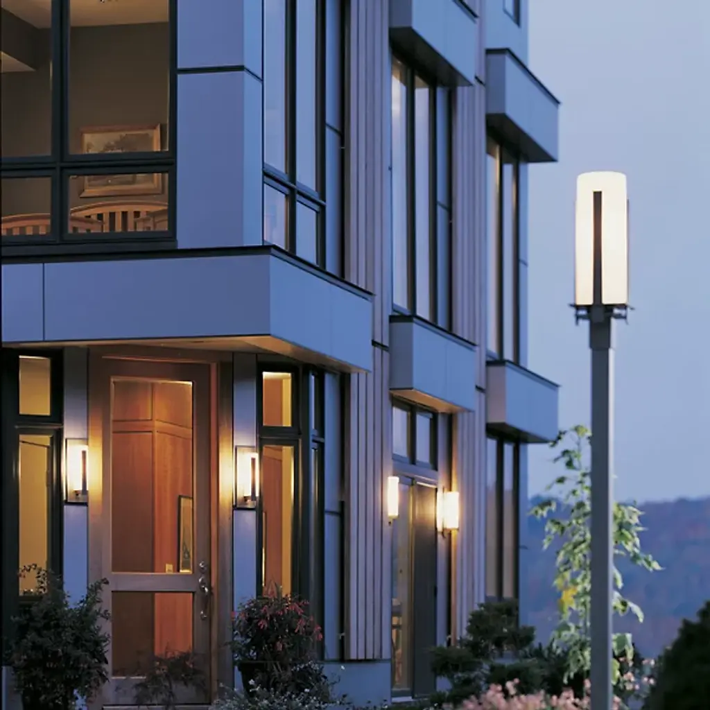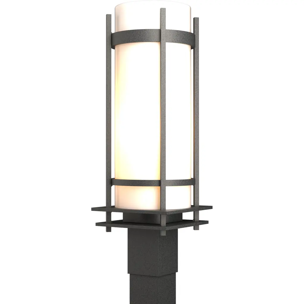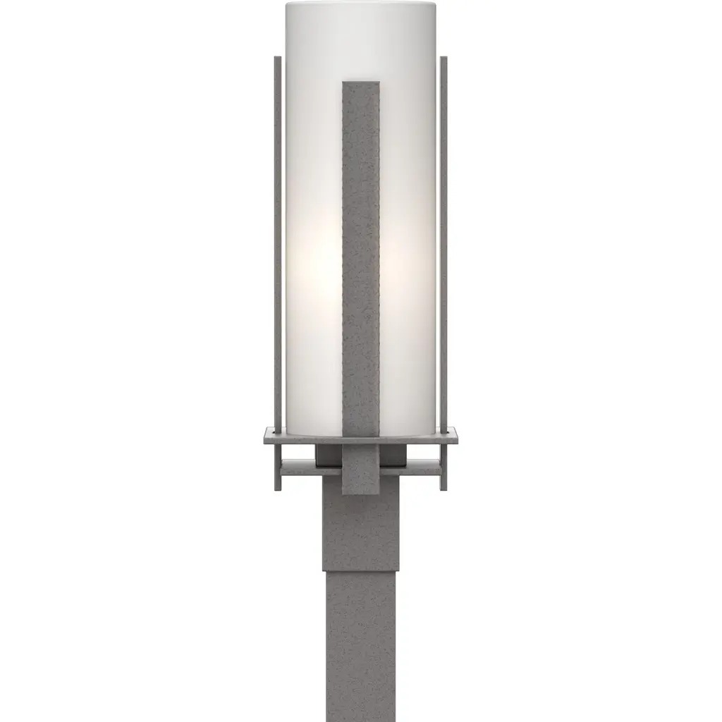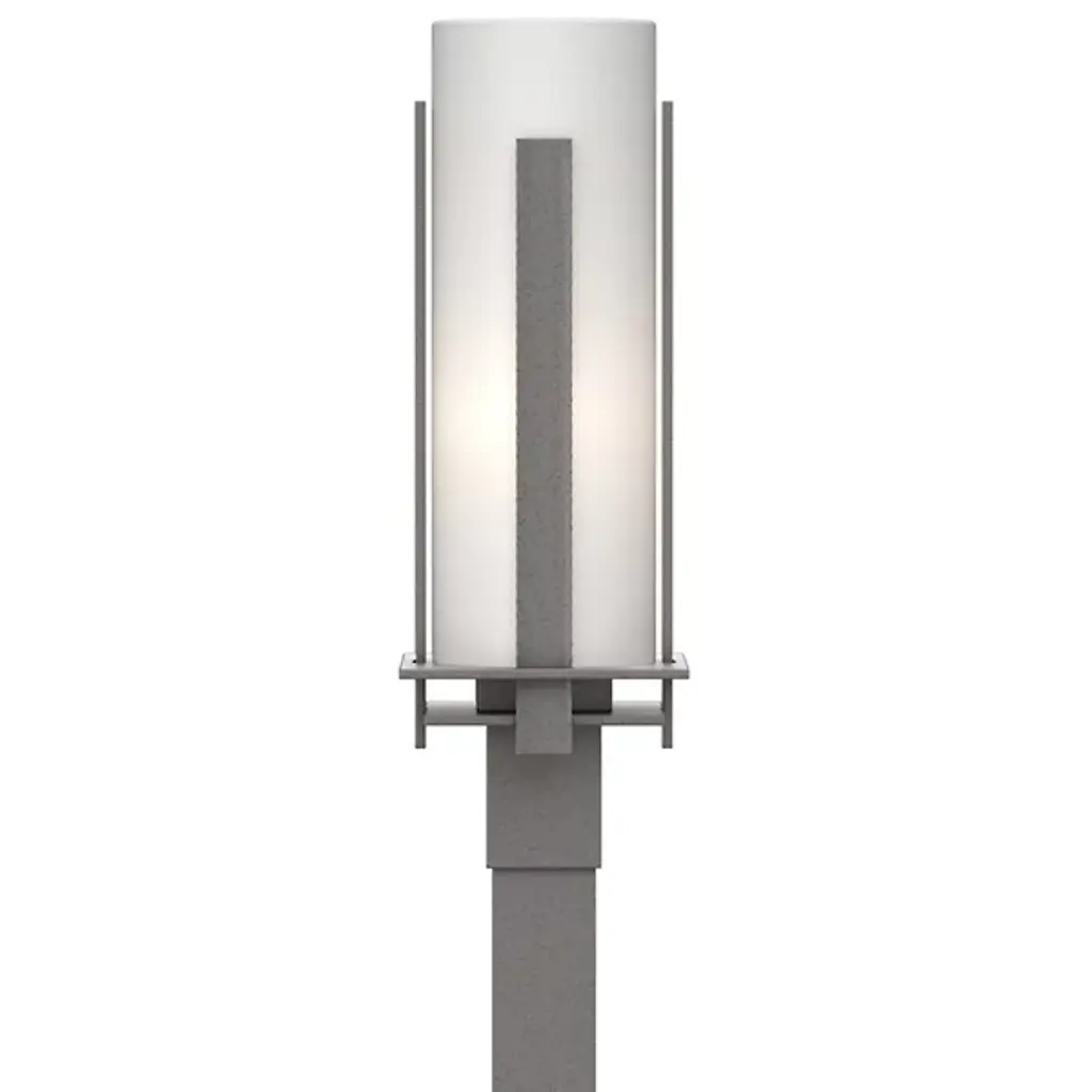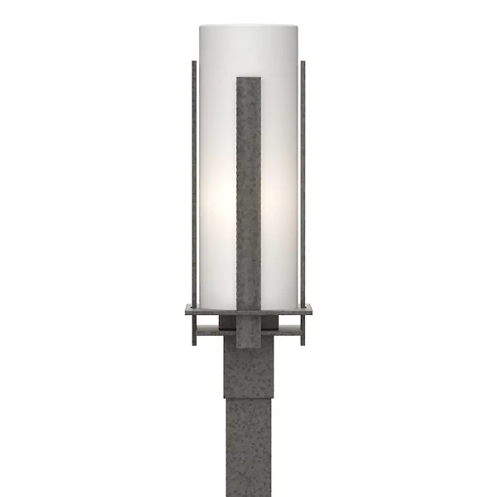 A striking combination of shapes and materials. The Forged Vertical Bars Coastal Outdoor Postmount by Hubbardton Forge is a bold and sophisticated addition to gardens, backyards, and pathways. It presents an elegant frame with a double square plate at the bottom and is installed to the ground with a long, slender post. Housed within the frame is a cylindrical shade made of opaque glass. It is hand-forged from aluminum with a coastal finish to ensure durability and withstand harsh weather elements.
