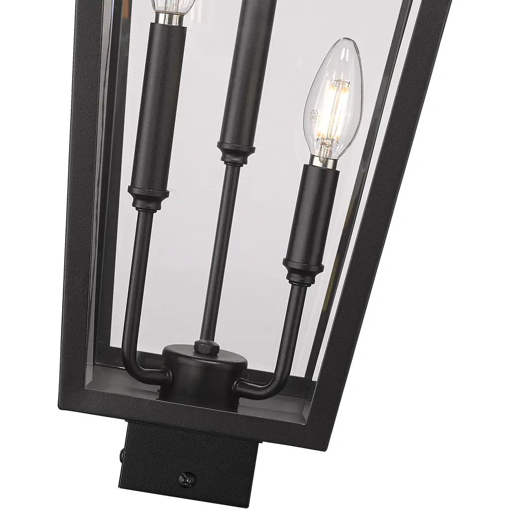 Offer fresh perspective in your landscaping or on a deck with this traditional three-light outdoor post mount fixture. It's a timeless design complete with a sloping top and long, lean beveled glass panels, creating a bright ambiance in any setting. The lantern is complete with stainless steel construction and a durable Coastal black finish.