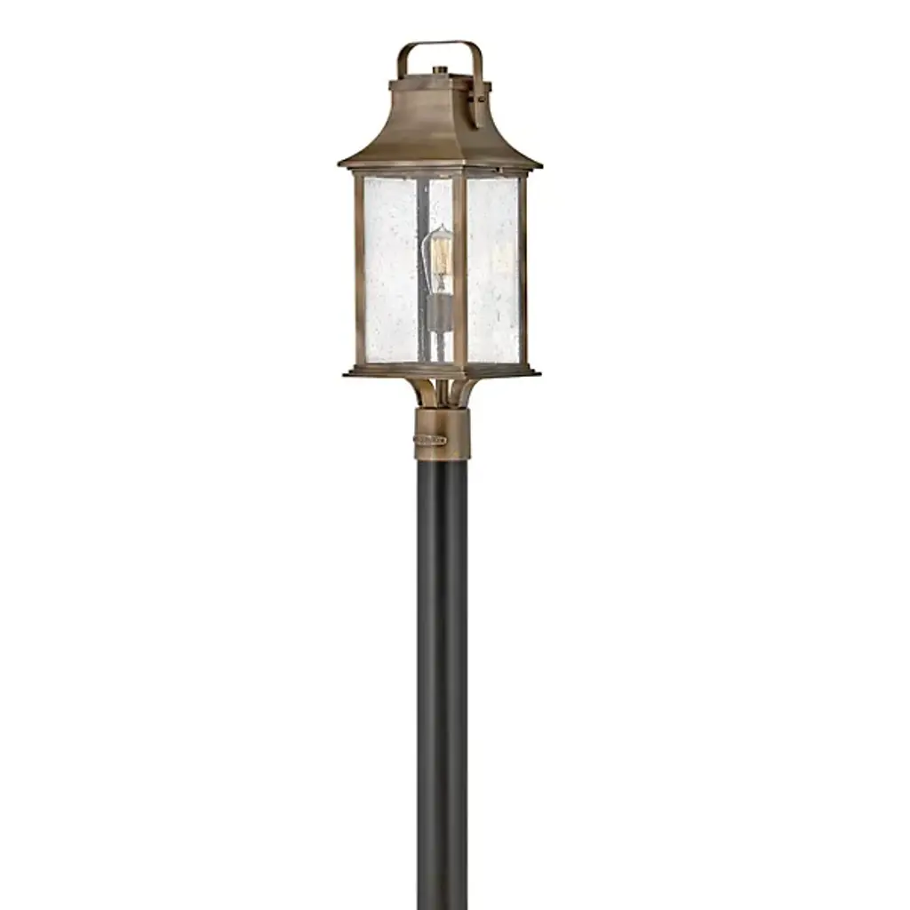 Go bold in your back yard or front walk with the angular Grant Post Mount from Hinkley Lighting. A functional design with a remarkable amount of retro detail reminiscent of old lanterns draws the eye to the complexities of its rounded handle, flat paneling, and flaring hood. All in cast aluminum with clear seeded glass paneling surrounding and warming open candelabra-style socketing, the Grant is wet-rated and durable for years of outdoor use. Be advised, however, the post is not included.
