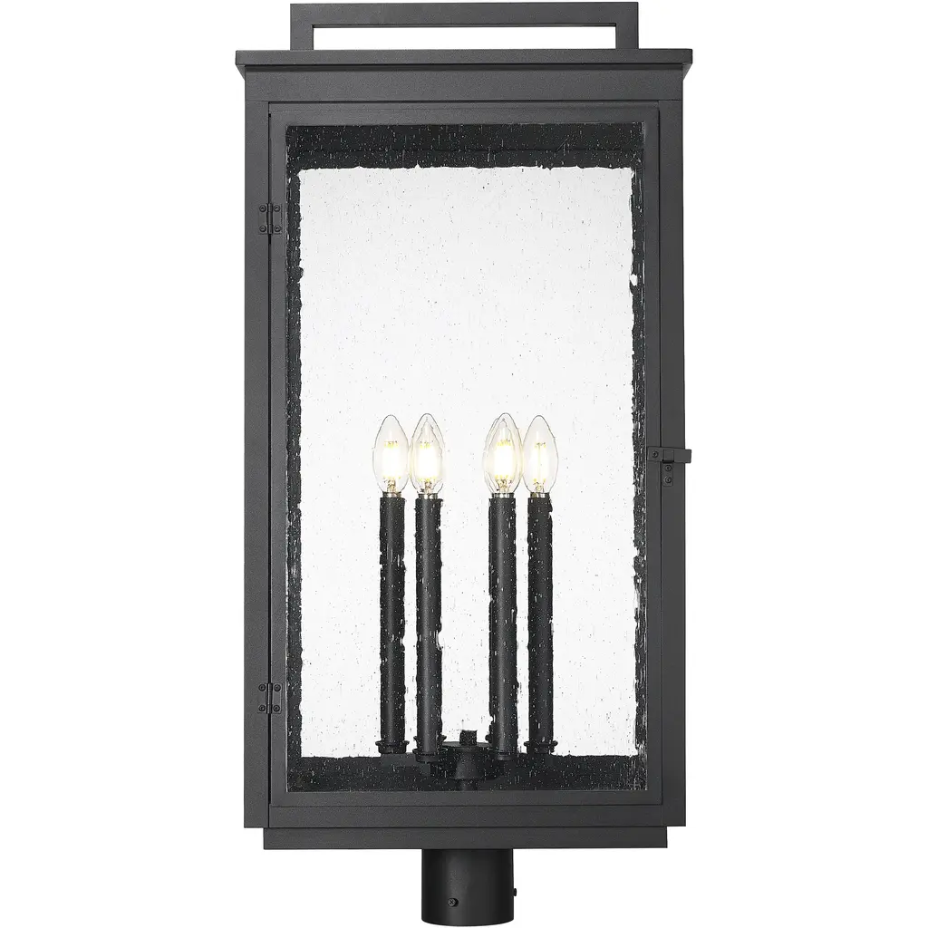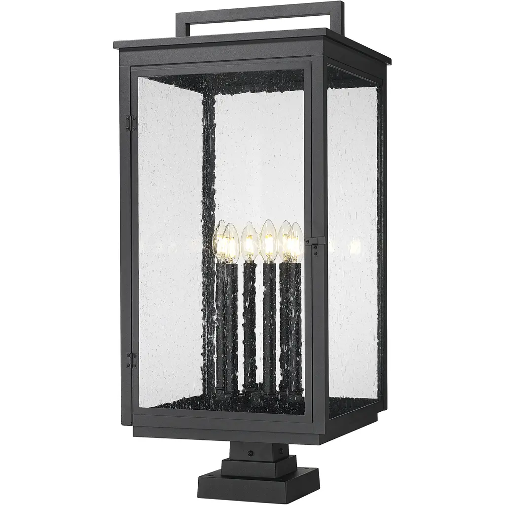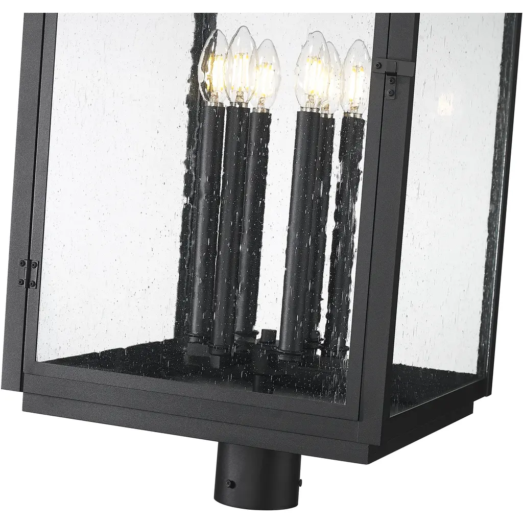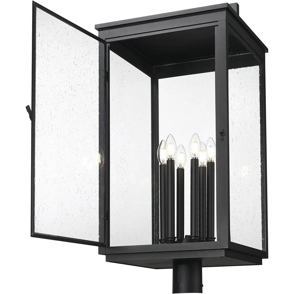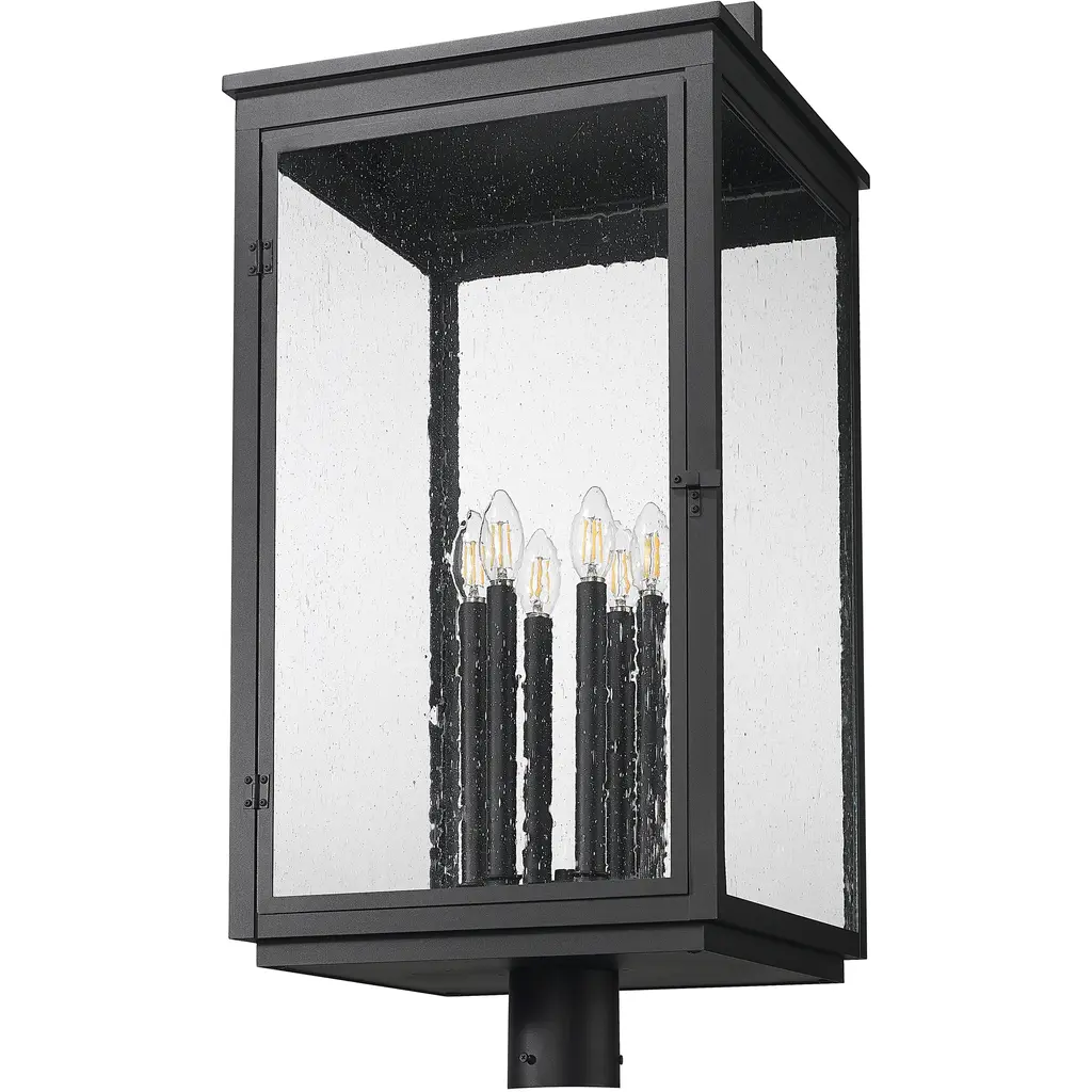 Speaking of style, this post mount fixture in sand black finish commands attention with its grand scale and graceful crown. Clear seedy glass encases six candle-style lights that offer a striking, atmospheric glow. Its the ultimate finishing touch for bold exteriors and expansive entrances.