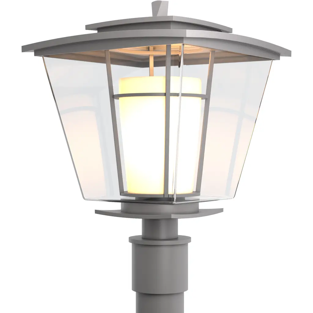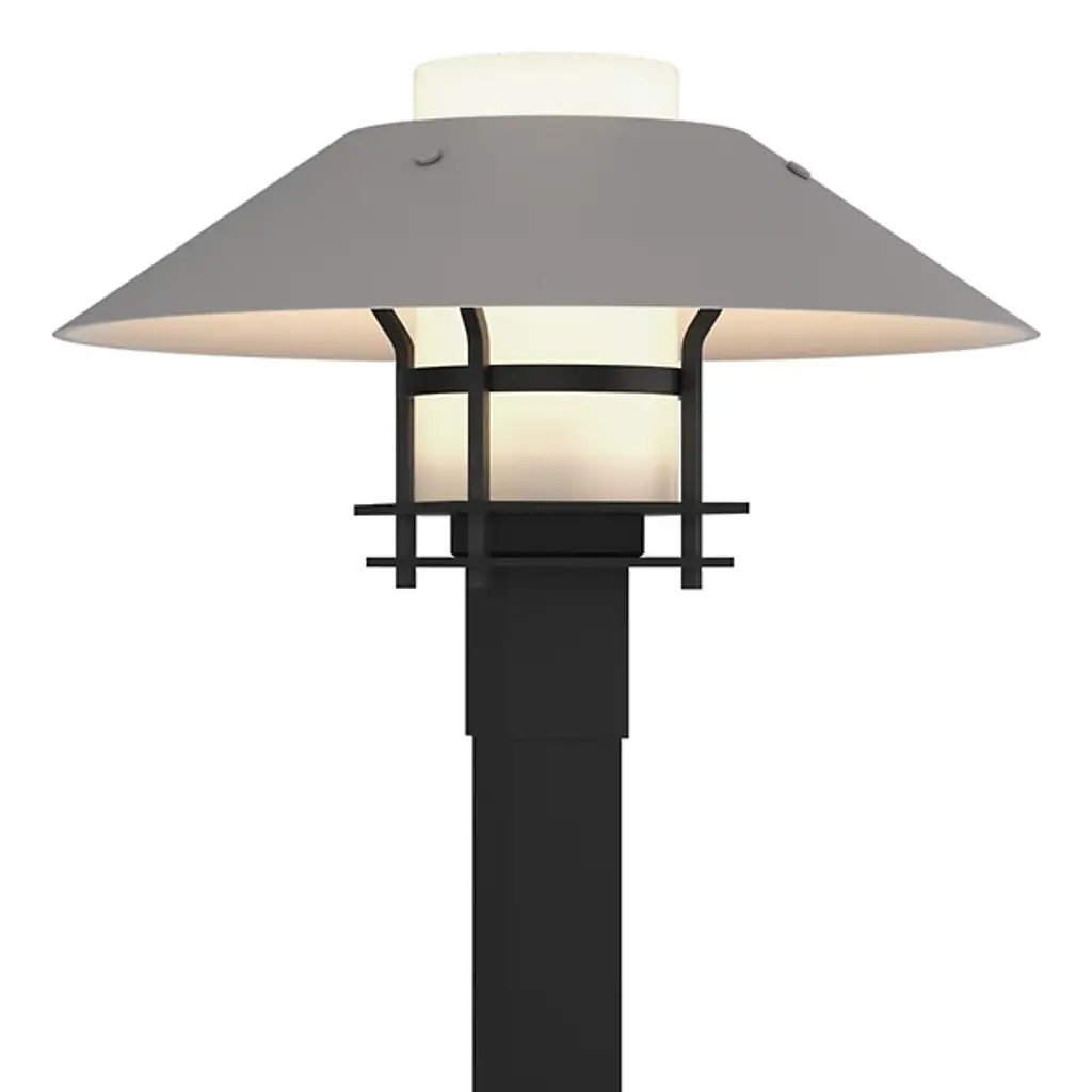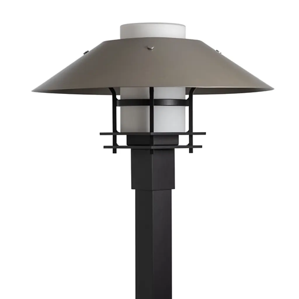 Brighten your outdoor porches and pathways with the Henry Outdoor Post Light from Hubbardton Forge. A clean surfaced transitional piece with Mission notes, it’s handmade to order by Vermont artisans and equipped with an outstandingly durable proprietary Coastal Outdoor finish to give it an extra robust edge. The light’s cylindrical glass diffuser rises from a square post housing, moderating the wet-listed lamping inside, while a spun metal dish shade with a stepped, open frame scatters a warm ambiance below.