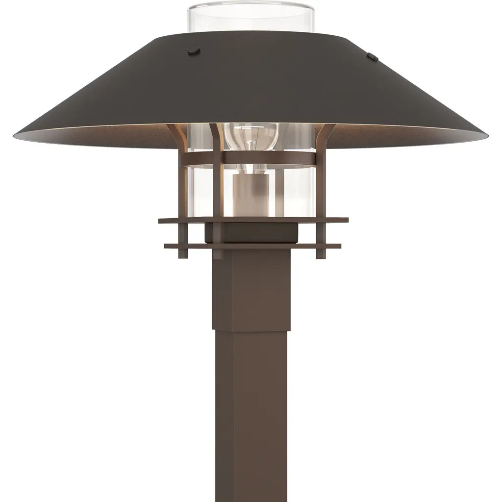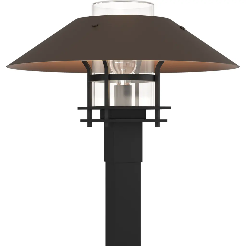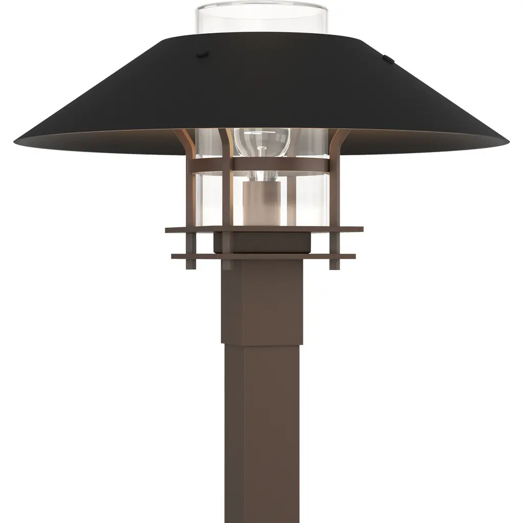 Brighten your outdoor porches and pathways with the Henry Outdoor Post Light from Hubbardton Forge. A clean surfaced transitional piece with Mission notes, it’s handmade to order by Vermont artisans and equipped with an outstandingly durable proprietary Coastal Outdoor finish to give it an extra robust edge. The light’s cylindrical glass diffuser rises from a square post housing, moderating the wet-listed lamping inside, while a spun metal dish shade with a stepped, open frame scatters a warm ambiance below.