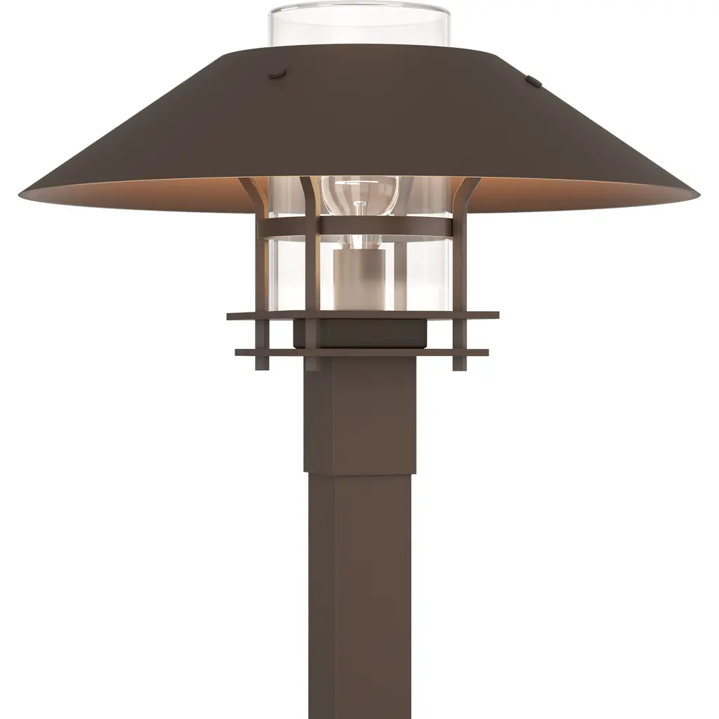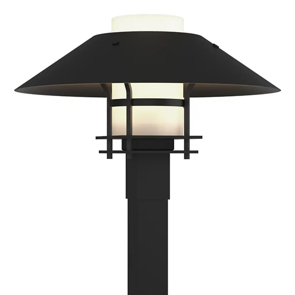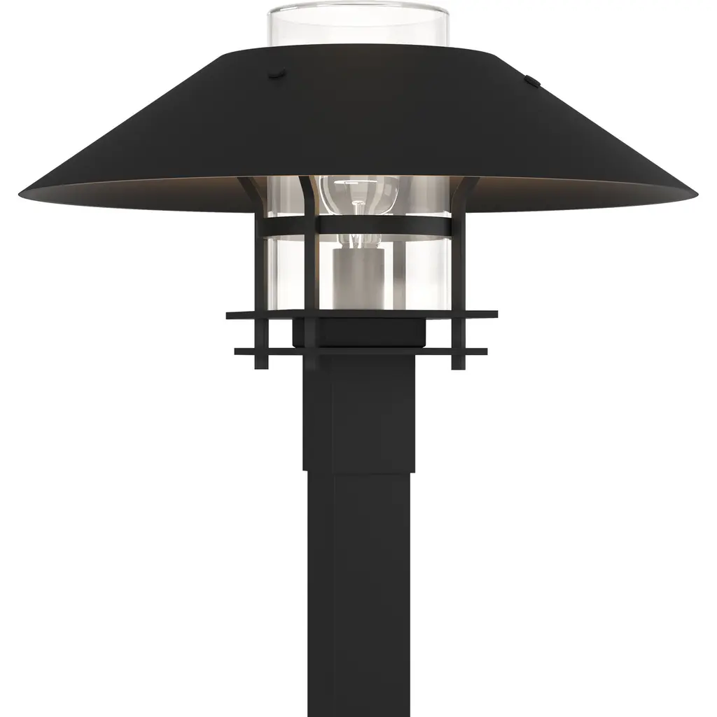 Brighten your outdoor porches and pathways with the Henry Outdoor Post Light from Hubbardton Forge. A clean surfaced transitional piece with Mission notes, it’s handmade to order by Vermont artisans and equipped with an outstandingly durable proprietary Coastal Outdoor finish to give it an extra robust edge. The light’s cylindrical glass diffuser rises from a square post housing, moderating the wet-listed lamping inside, while a spun metal dish shade with a stepped, open frame scatters a warm ambiance below.