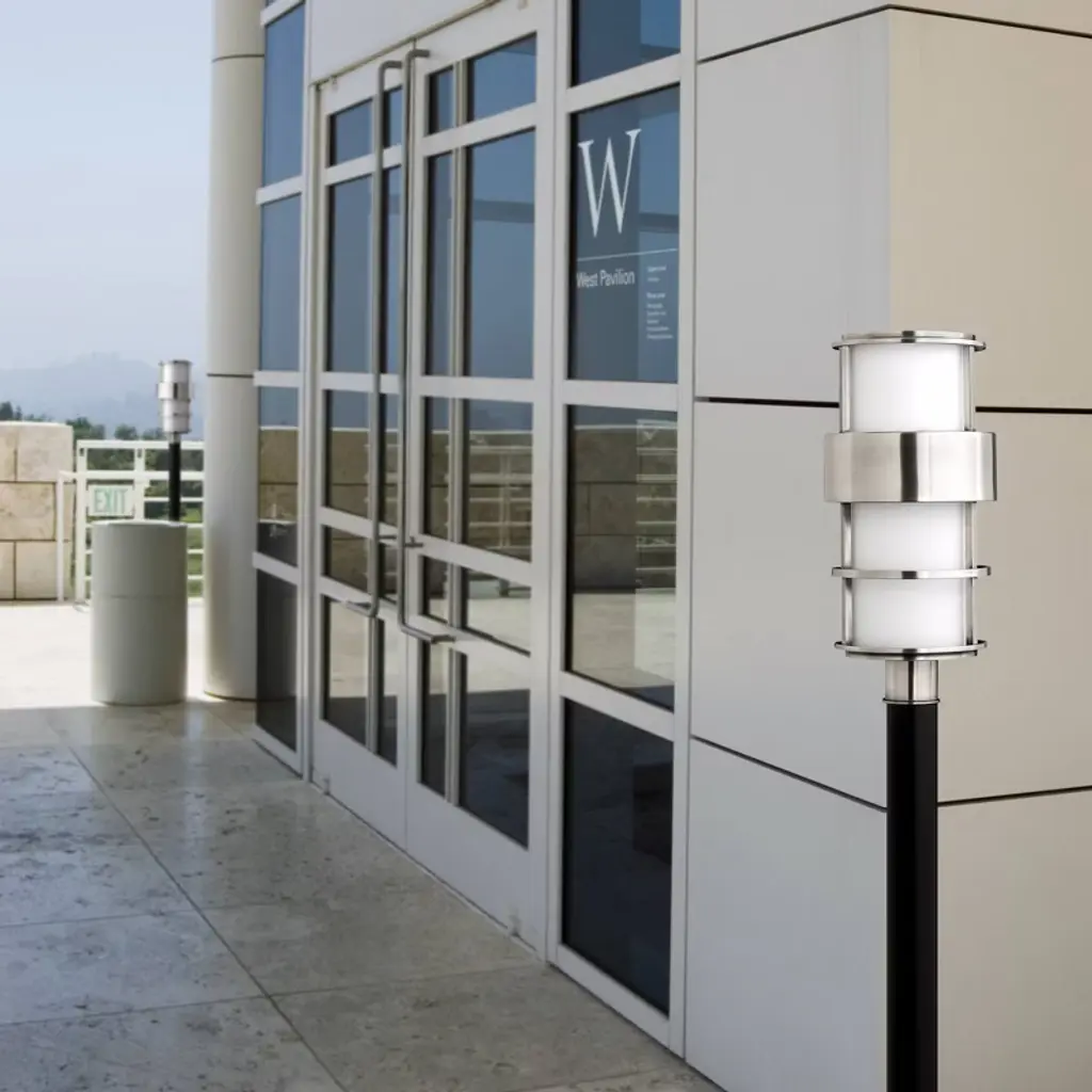 This modern outdoor post-mount light features stainless steel construction and cased opal etched glass. Post not included. A beautiful look for your home from the Saturn outdoor collection by Hinkley Lighting.