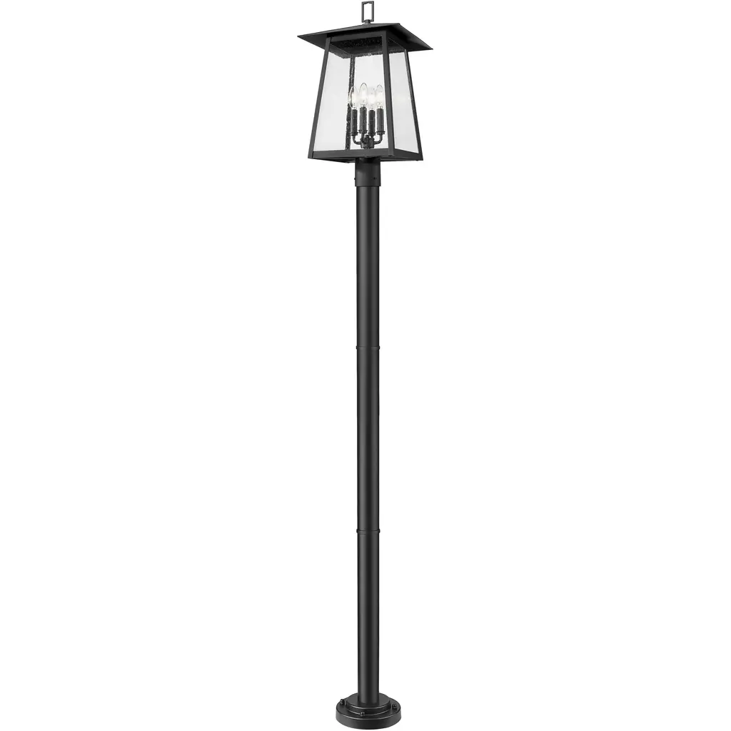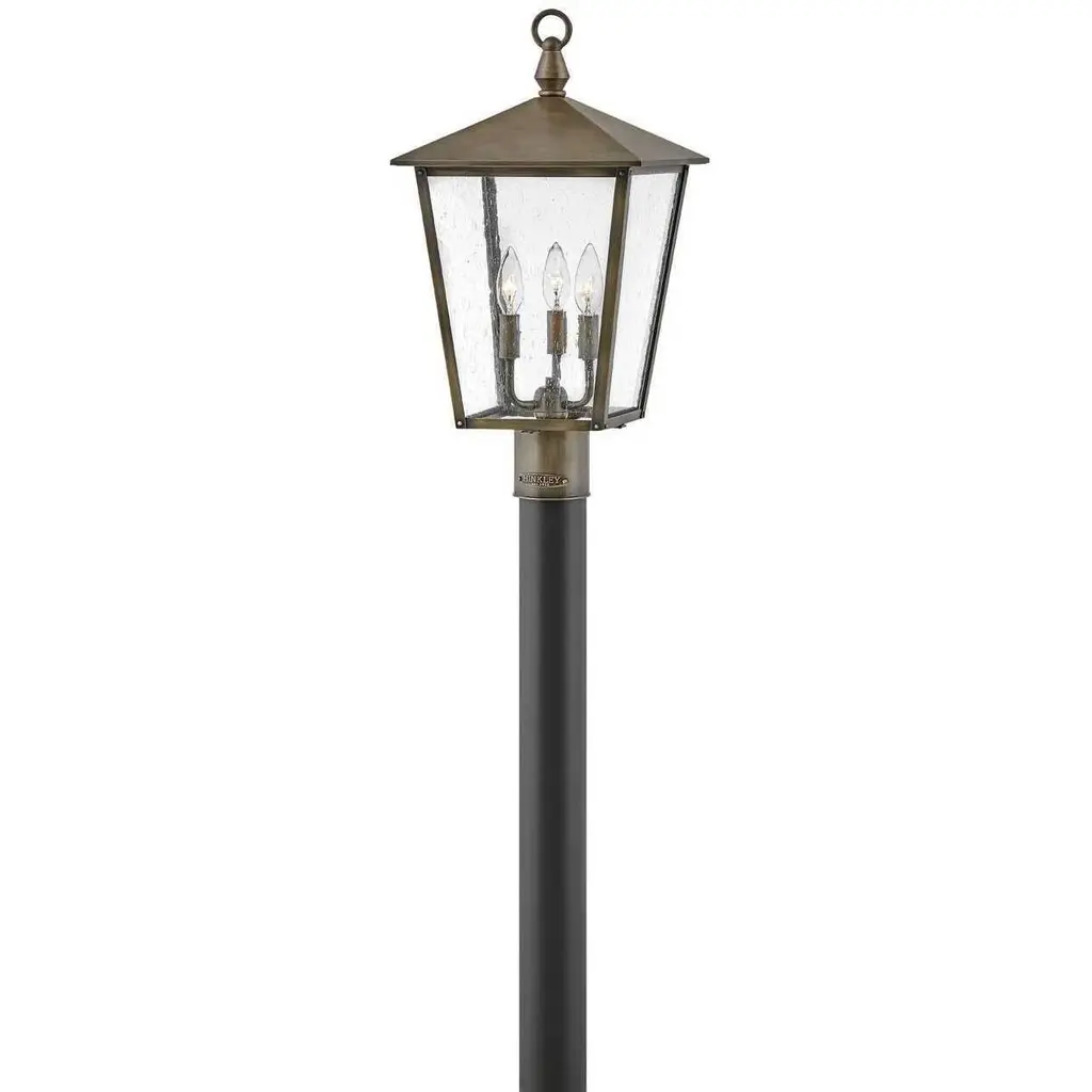 Clean and elegant, the Huntersfield Outdoor Post Light from Hinkley Lighting lights the way in your yard with a design inspired by traditional European lanterns. The oversized aluminum body upholds the pointed shade adorned with four panels of clear, seeded glass. The shade ends with a rounded finial that provides a stately appearance as it caps the piece. A set of candelabra-style bulbs rests within the shade, expressing a bright and even layer of light.