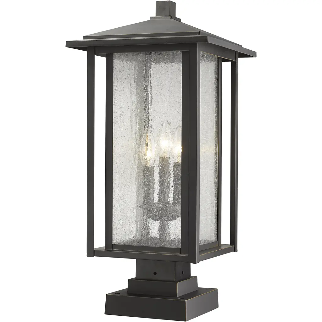 Three Light Outdoor Post Mount from Manningham collection in Olde Bronze finish. Number of Bulbs 3. Max Wattage 60.00. No bulbs included. You`ll love the traditional elements of this 3 light outdoor post mount from the Manningham collection. The Clear Seedy glass partners with the strong lines and detailed cap accents in Olde Bronze creating a colonial inspired illuminating dream for the outside of your home. No UL Availability at this time.