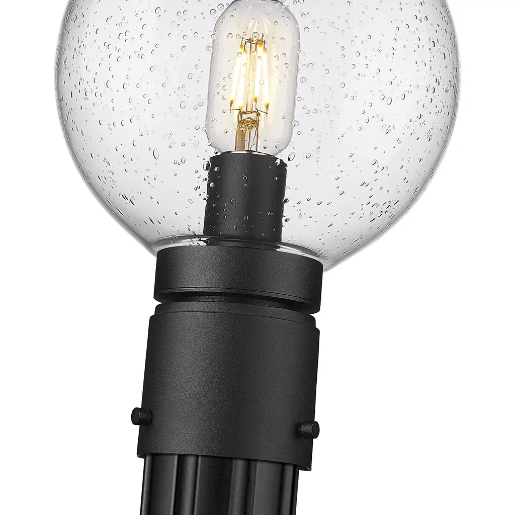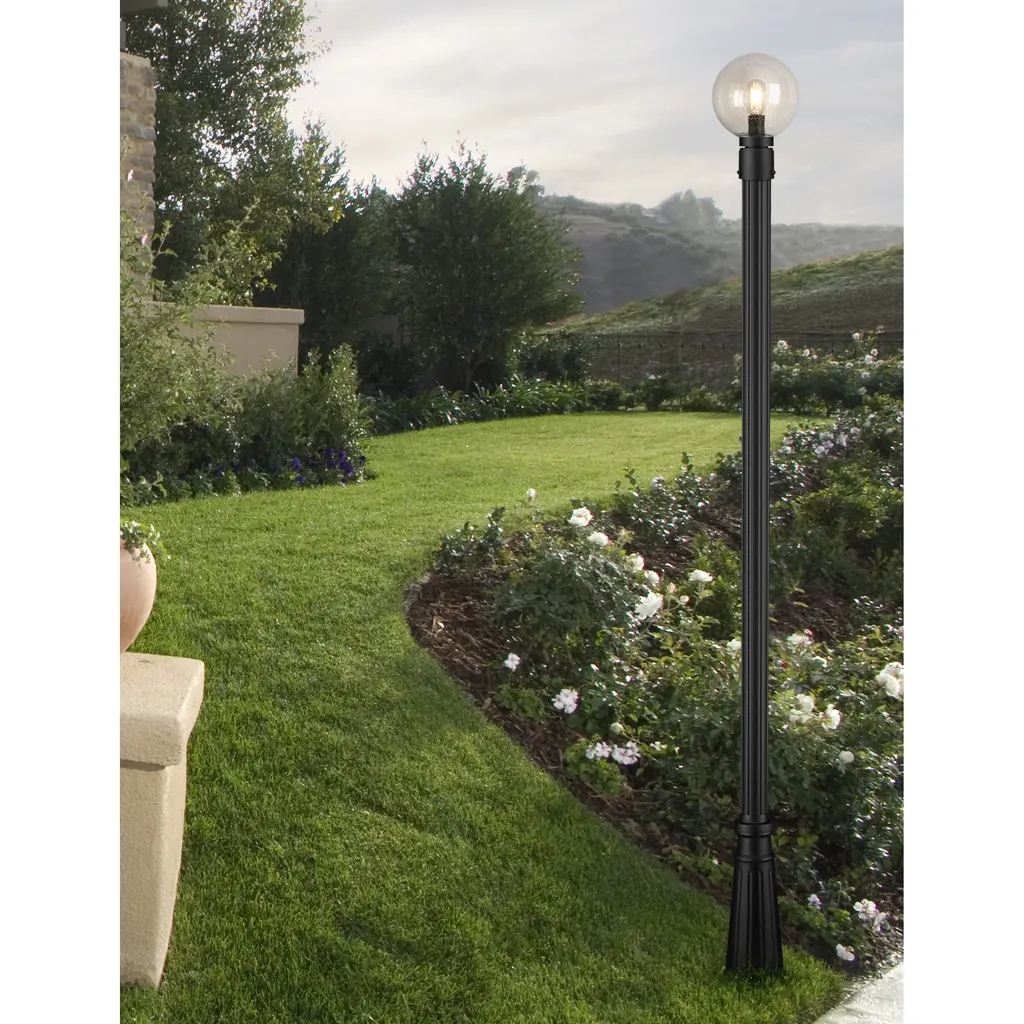Village charm infused in exterior lighting shapes a decadent look with style. Emulate a retro feel in a front yard or walkway with this epic one-light outdoor post mounted fixture fashioned of versatile black finish aluminum in a frame with an ornate tapered base. A delicate clear seedy glass globe creates ultimate elegance.
