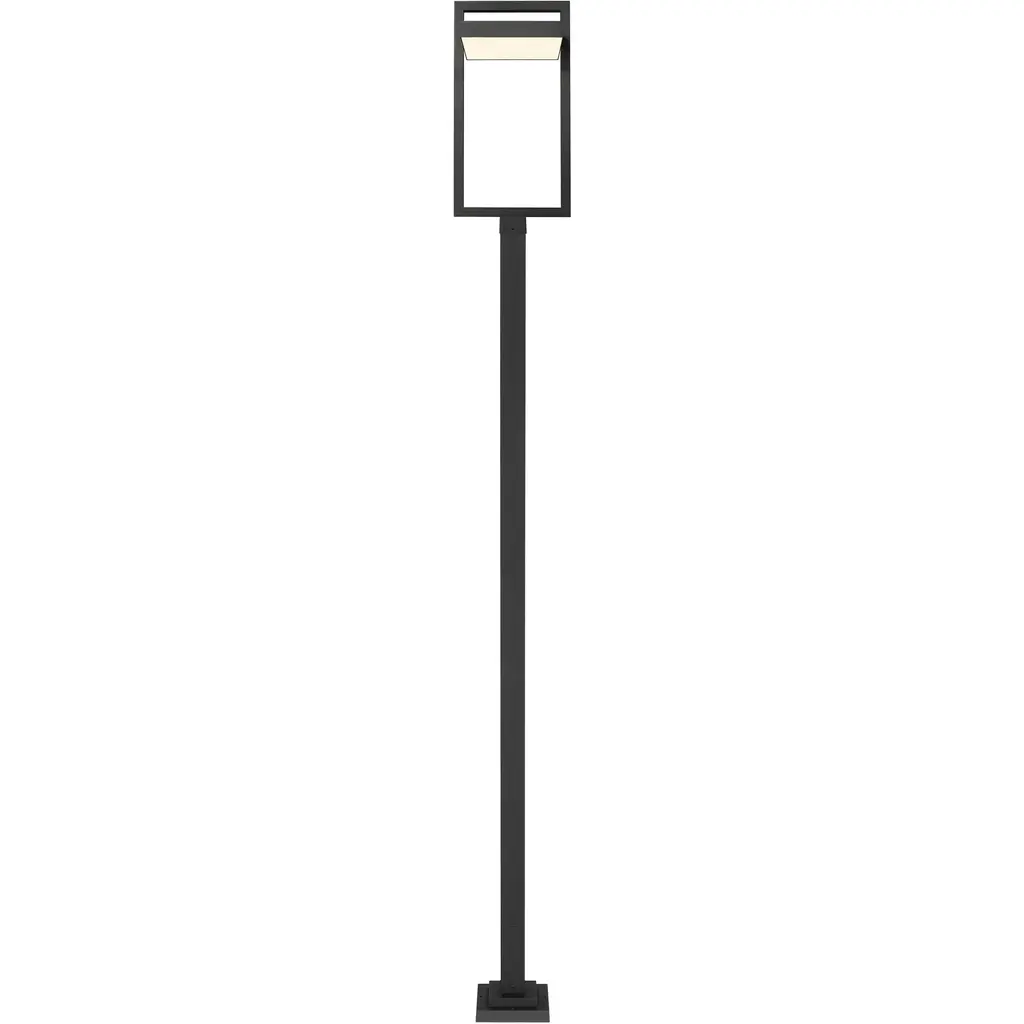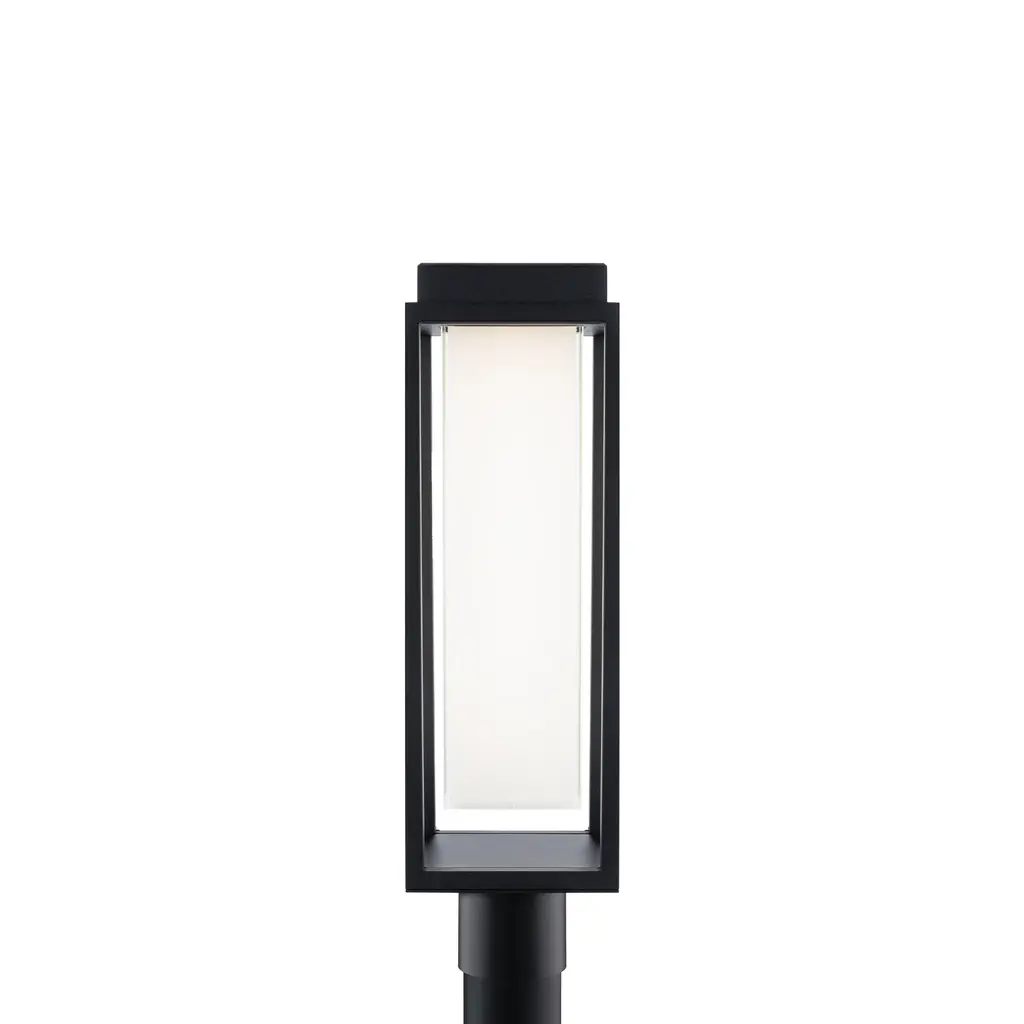 A cutting-edge solution for illuminating your contemporary patio, deck or garden area, this one-light outdoor post mounted fixture delivers chic minimalism with its angular bold black finish aluminum frame and four-sided post. A sand blast finish white glass shade uses LED-integrated technology to provide a strong, energy-efficient glow to light up evenings outdoors.