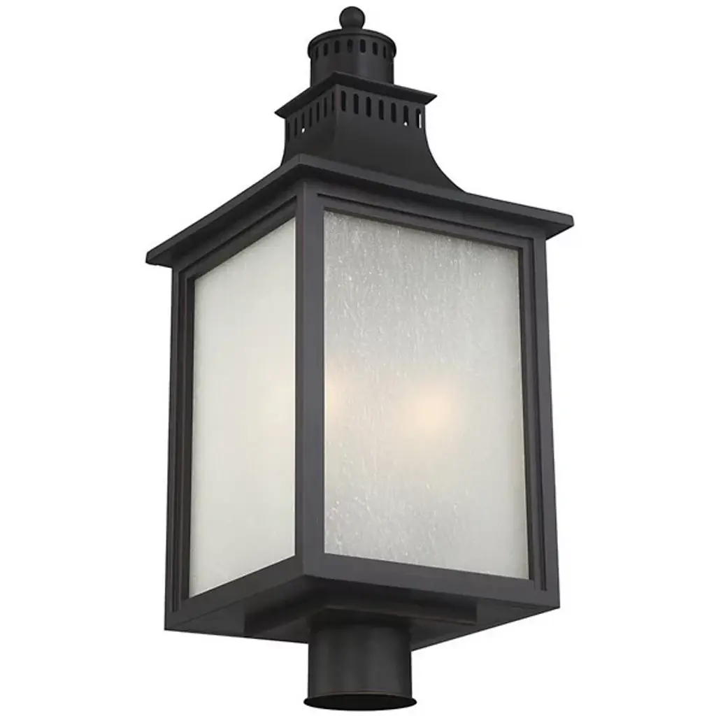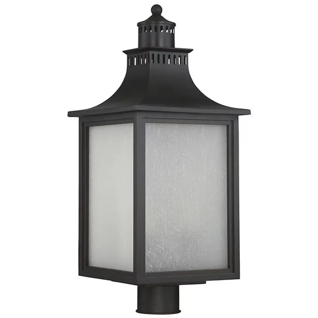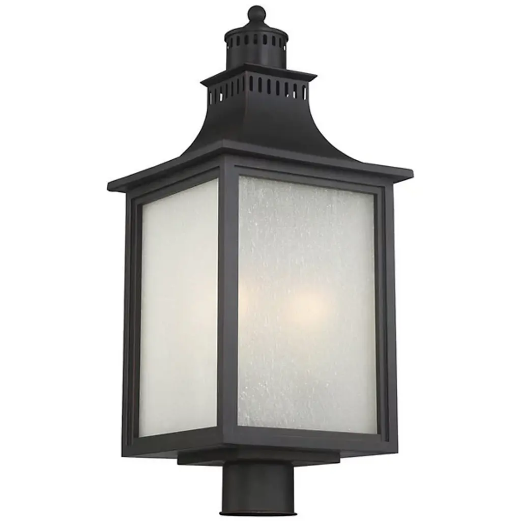 The Monte Grande Outdoor Post Light from Savoy House is a sophisticated take on the classic design of a box lantern. This elegant fixture enhances the porch and pathway alike with traditional charm and warmly welcoming guests. The English bronze finish complements various settings, supported by a circular post mount. The wet-rated lamping is surrounded by pale cream seeded glass panels, pairing transitional style with vintage charm. The post is sold separately.