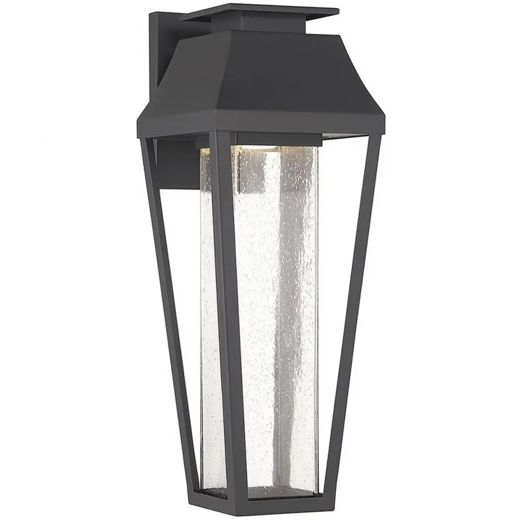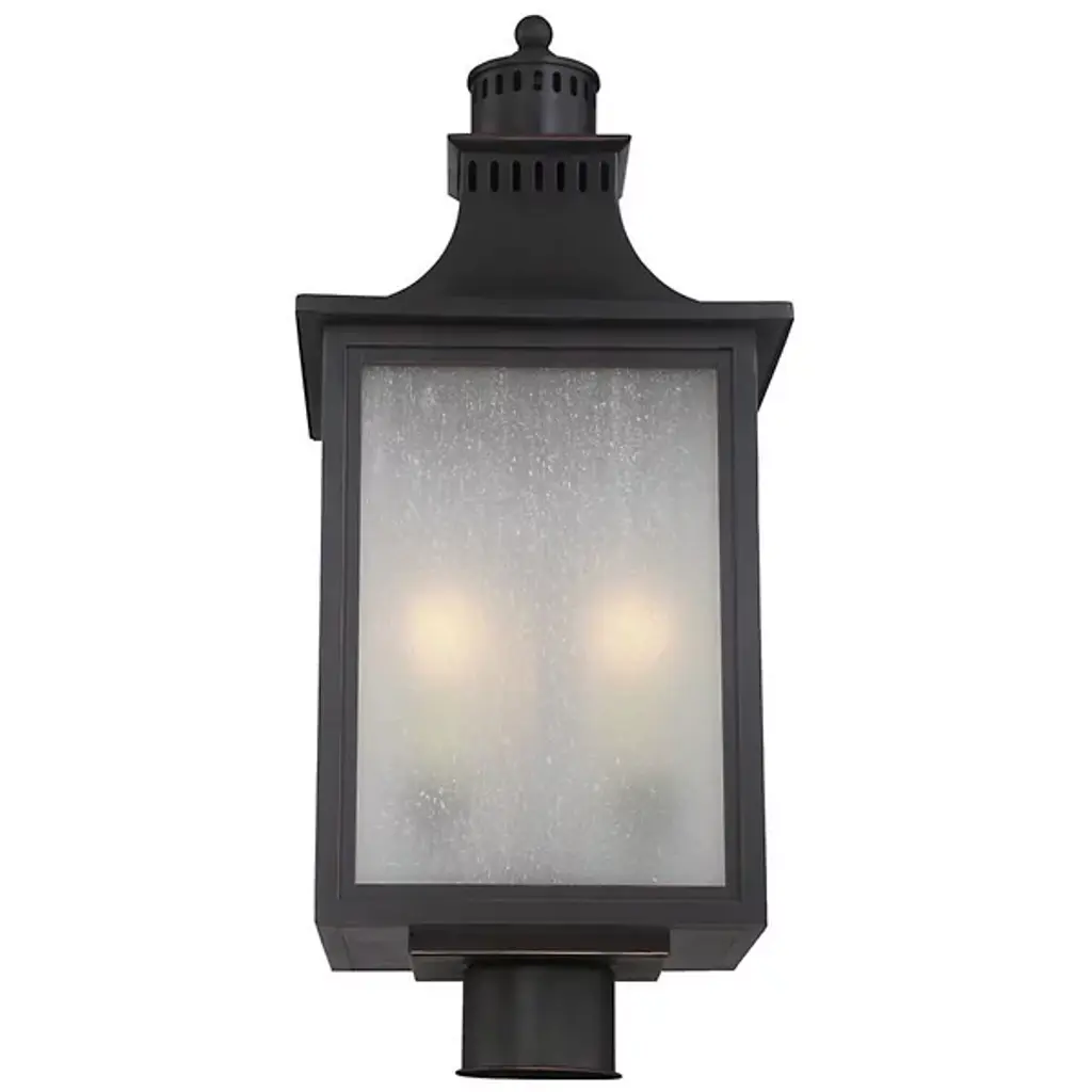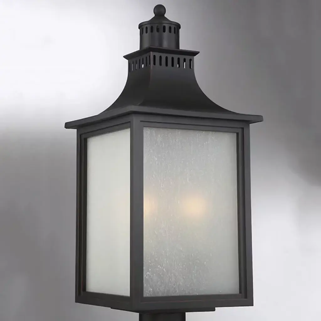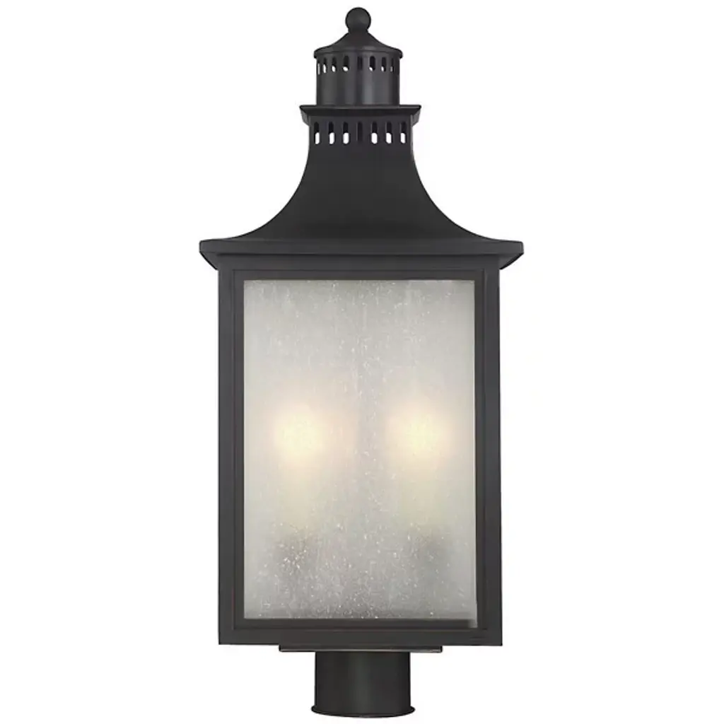 The Monte Grande Outdoor Post Light from Savoy House is a sophisticated take on the classic design of a box lantern. This elegant fixture enhances the porch and pathway alike with traditional charm and warmly welcoming guests. The English bronze finish complements various settings, supported by a circular post mount. The wet-rated lamping is surrounded by pale cream seeded glass panels, pairing transitional style with vintage charm. The post is sold separately.