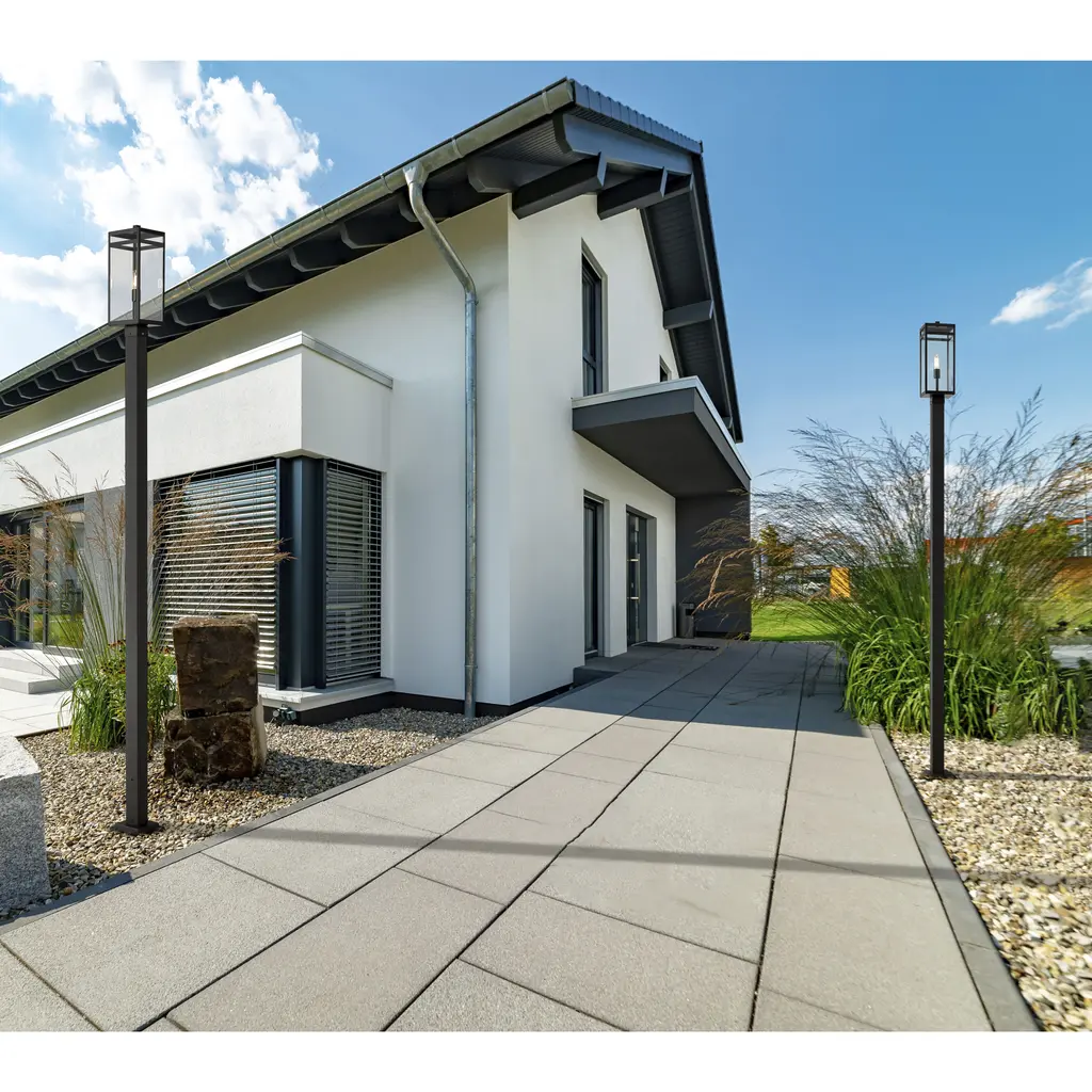 Crisp modern styling embellishes the contemporary vibe of the Nuri one-light outdoor post mounted fixture. Bring an updated source of ambient lighting to a sidewalk or fence space, focusing on geometric elements in a black steel finish frame and matching post and base. Clear glass panels offer a glimpse of a charming slender bulb base.