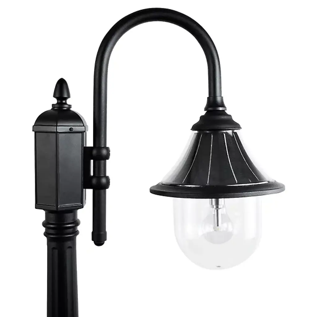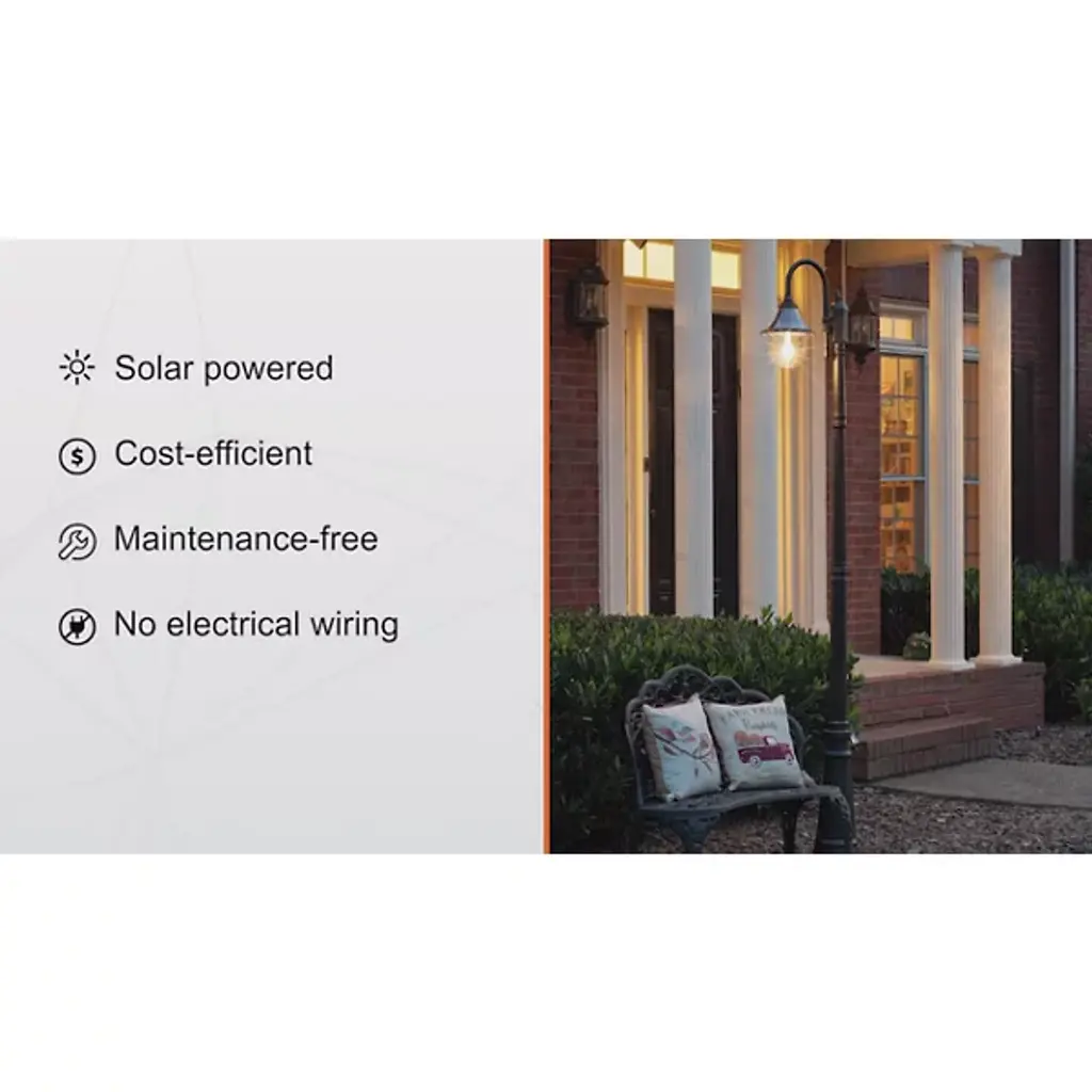 The Orion Solar LED Post Light from Gama Sonic is a modern solar lamp with an urban industrial twist, standing at 95 inches tall for a striking look. Quick installation with included hardware makes it a cost-effective replacement for electric or gas-powered outdoor lighting. Crafted from weather-resistant cast aluminum and rigid resin in a black finish, the Orion features a solar LED light bulb and Morph technology. This innovative design morphs into a solar panel, maximizing sun exposure for longer duration and brighter light.