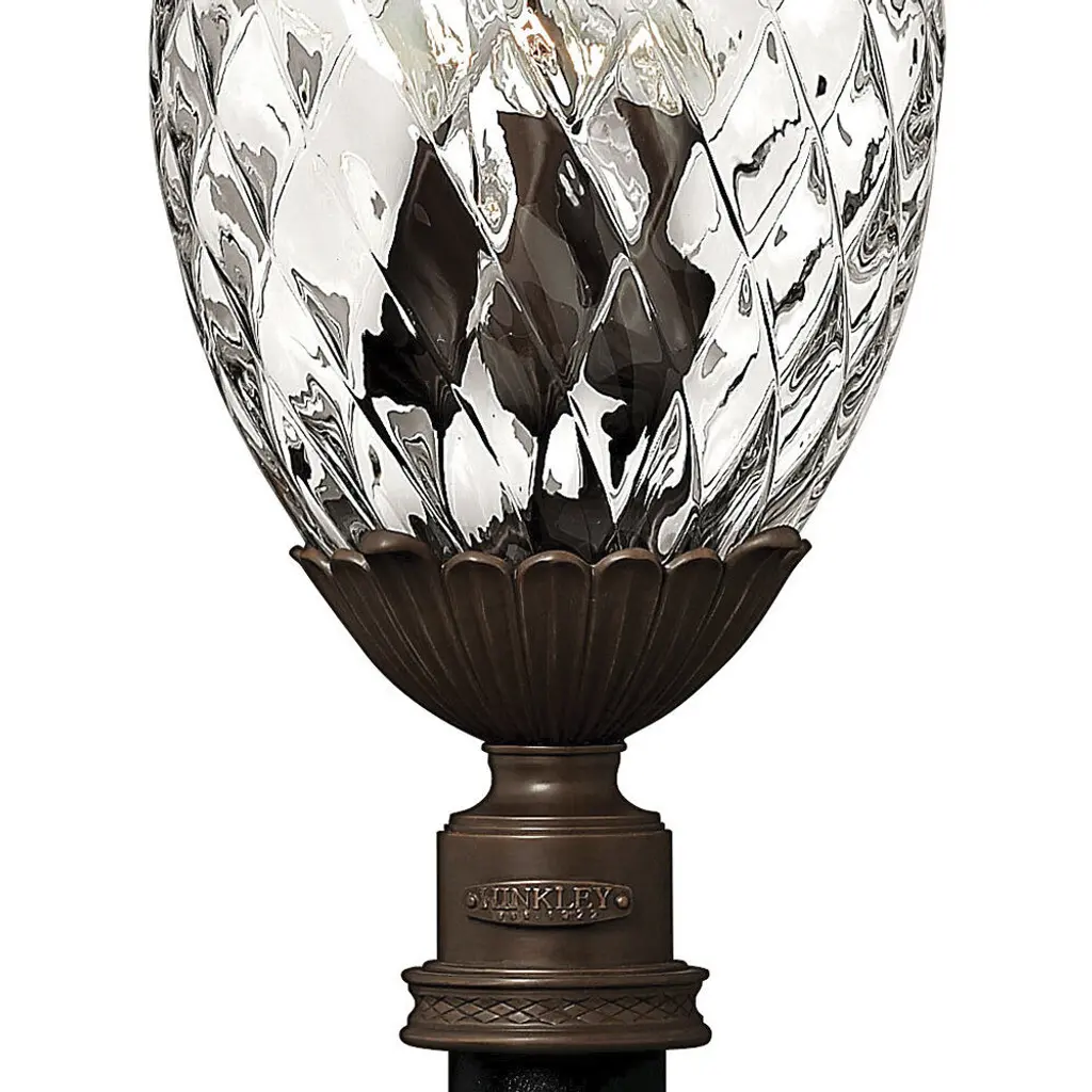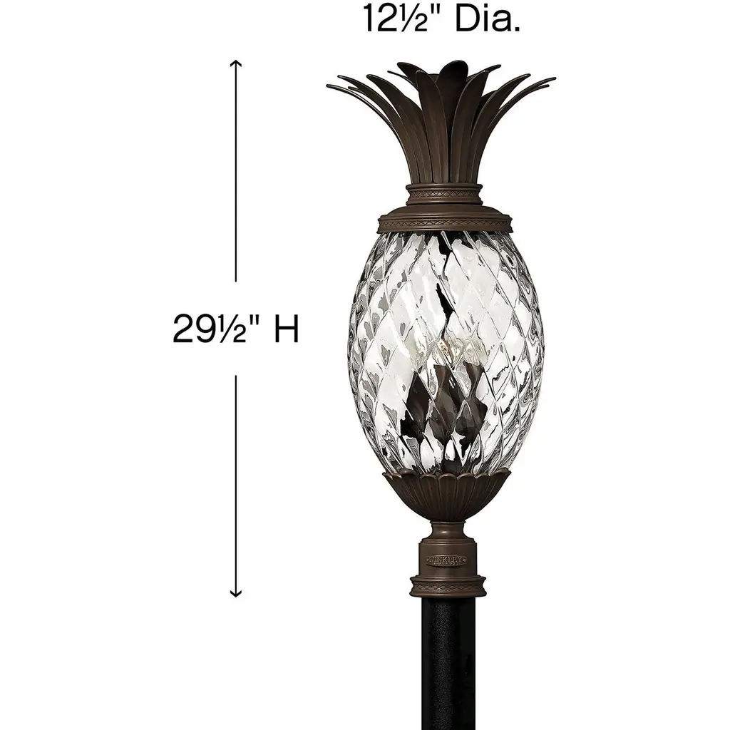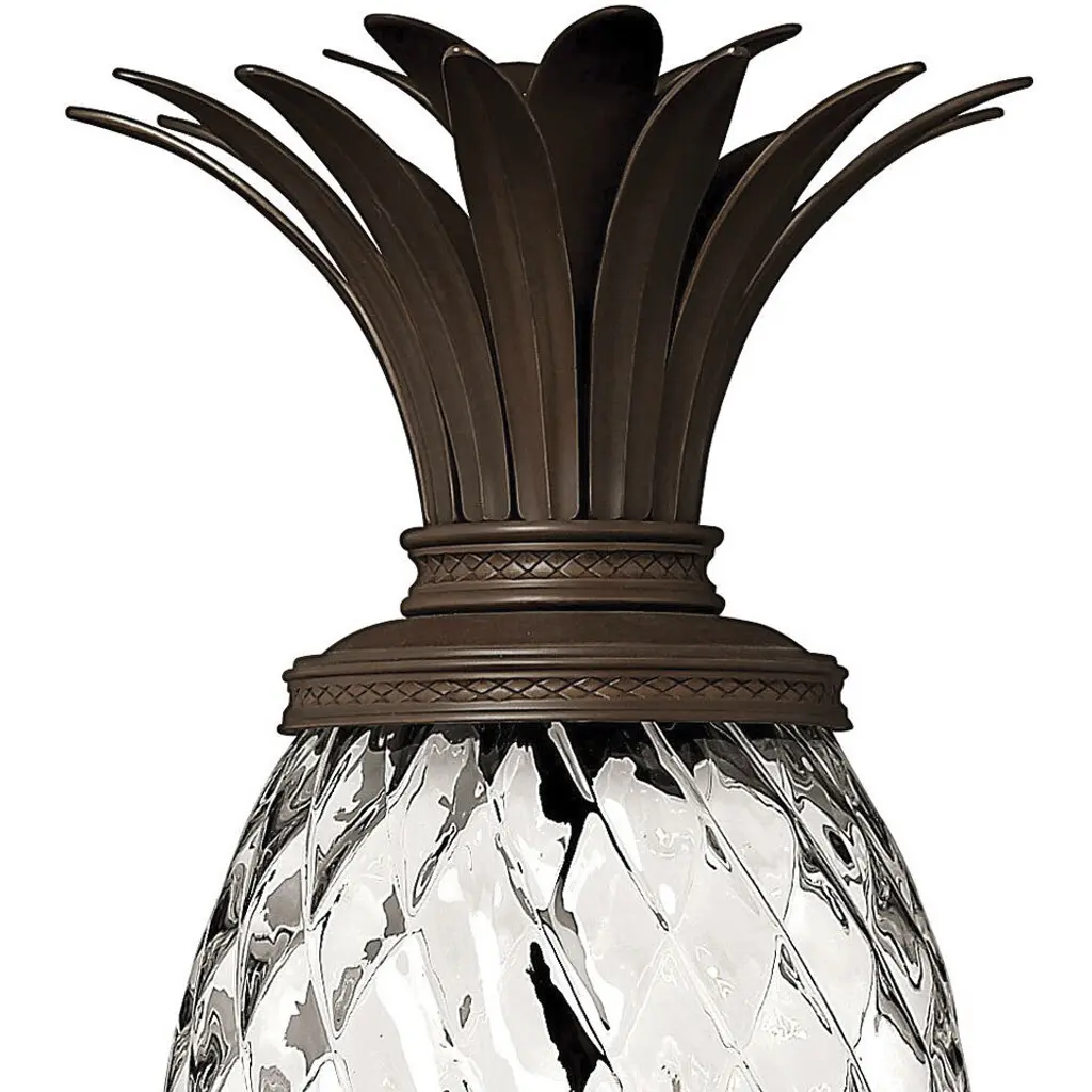 A Hinkley classic, the ornate Plantation collection features exceptional pineapple shaped, clear optic glass that makes a noble statement with matching candle sleeves and elaborate, decorative cast detailing.
