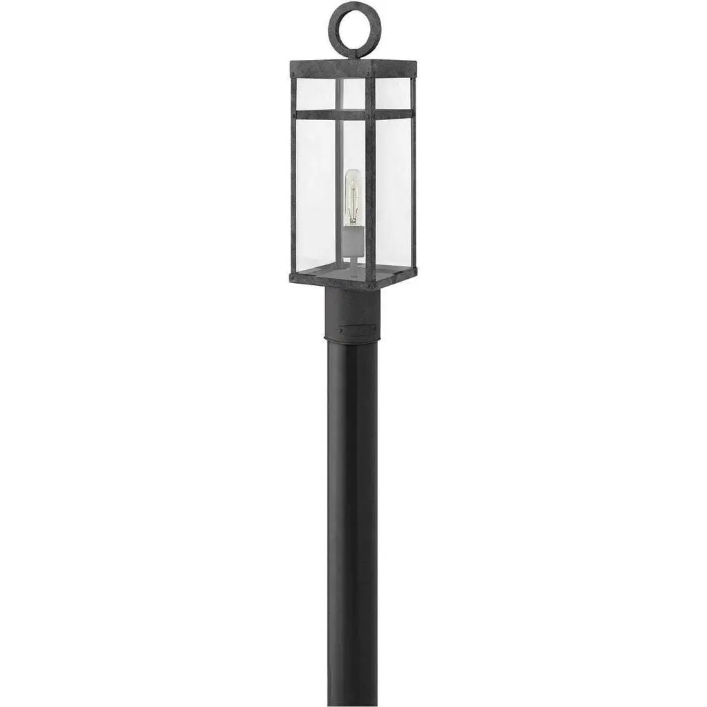 Makes a stately statement. Discover the power of landscape illumination with a Porter Outdoor Post Mount by Hinkley Lighting. It delivers optimum beauty, function, and safety when used to brighten a driveway, front steps or patio area. Featuring fine rivet details and a sturdy hanger loop on its design that fuses modern farmhouse with artsy industrial, this fixture creates an outdoor space that's both distinctive and inviting. A vintage filament T-bulb is included for instant installation.
