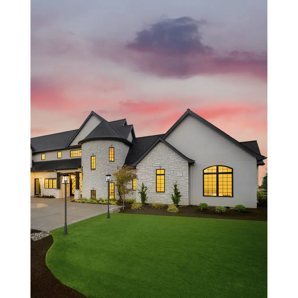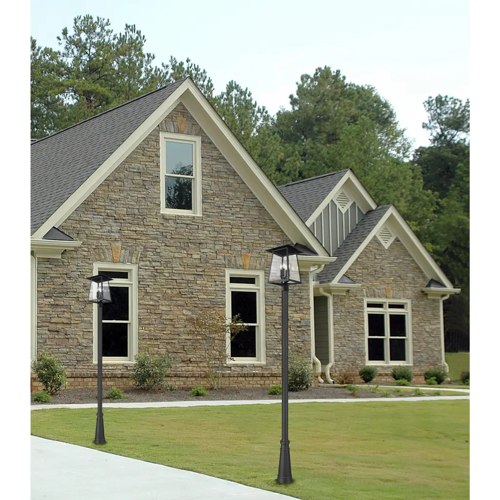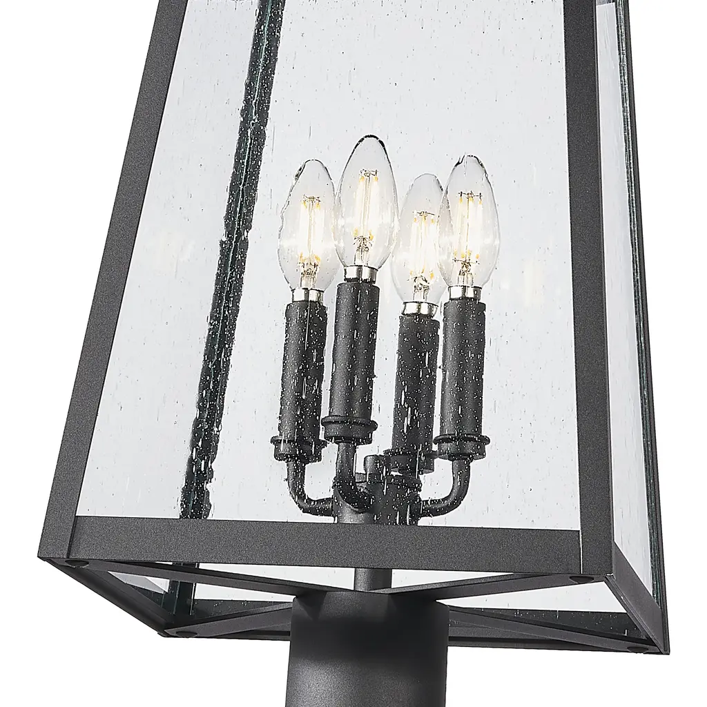 Plenty of ambient illumination glows from this four-light outdoor post-mounted fixture embellishes any setting. With a lantern motif and timeless design, it offers a sleek pole and frame made of black finish aluminum, smooth and pleasing, as clear seedy glass panels add a perfect dose of texture. Use dimming features to create just the right ambiance for every occasion and setting.