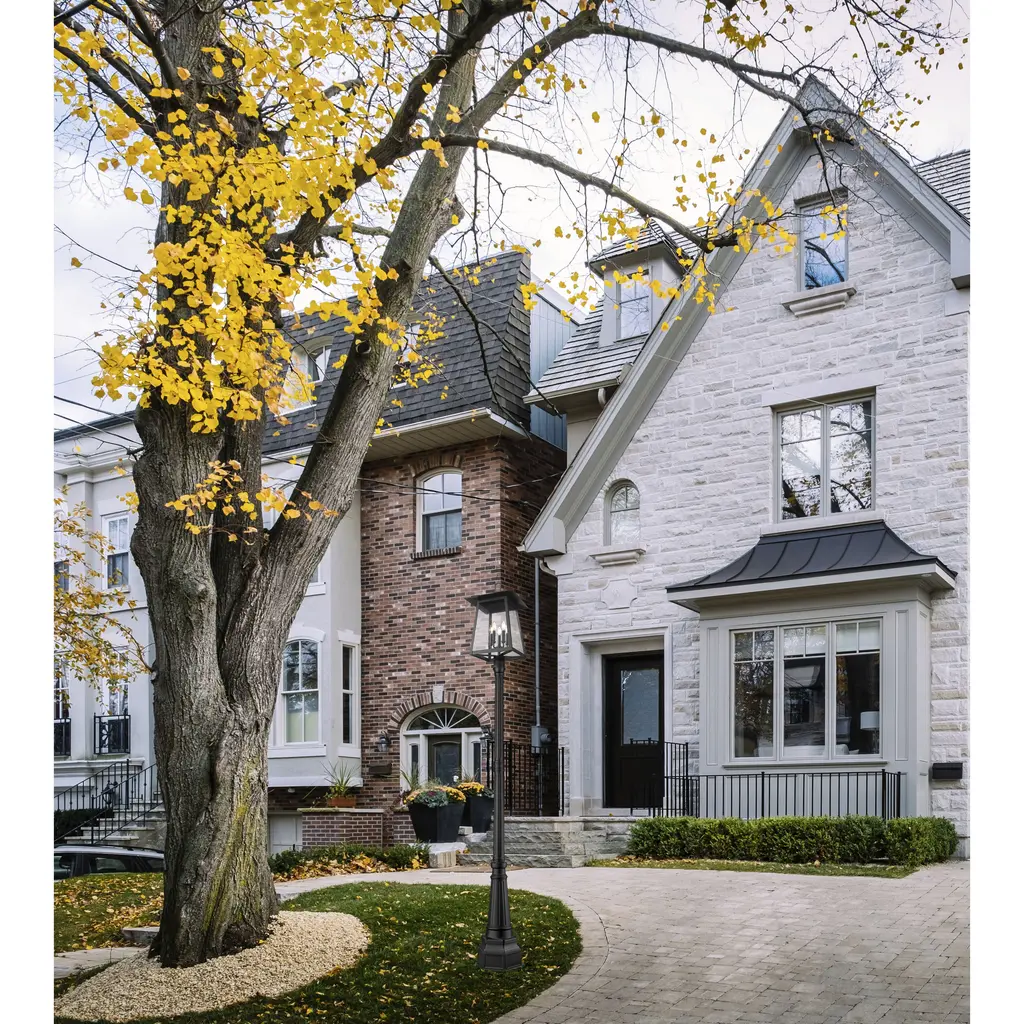 A charming village vibe is modern and fresh as this five-light outdoor post-mounted fixture upgrades a front or back yard. It showcases a lantern profile and gently contoured pole, with a Coastal black finish over aluminum for sleek, smooth appeal. It's dimmable, adding flexibility to lighting options in a walkway or in your land and hardscaping.