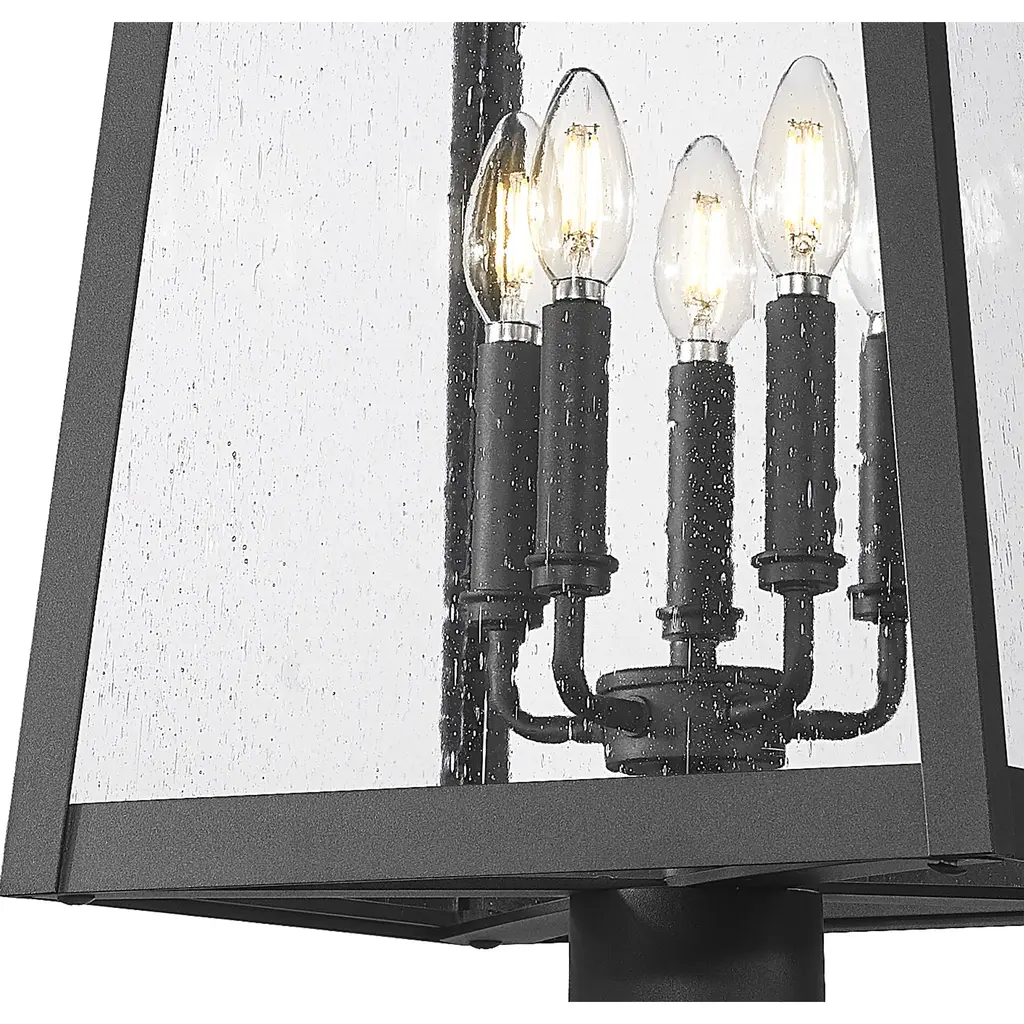 A boost to any exterior setting, this five-light outdoor post-mounted fixture offers soft, glowing illumination. With a lantern motif and gently contoured pole silhouette, it features aluminum construction with a smooth Coastal black finish. Seedy glass panels add vintage texture and a candelabra light mount contributes a touch of romance to the overall look.