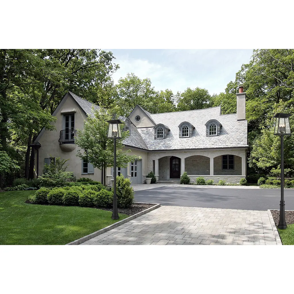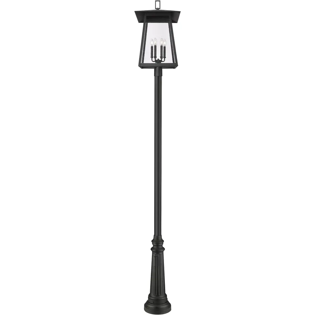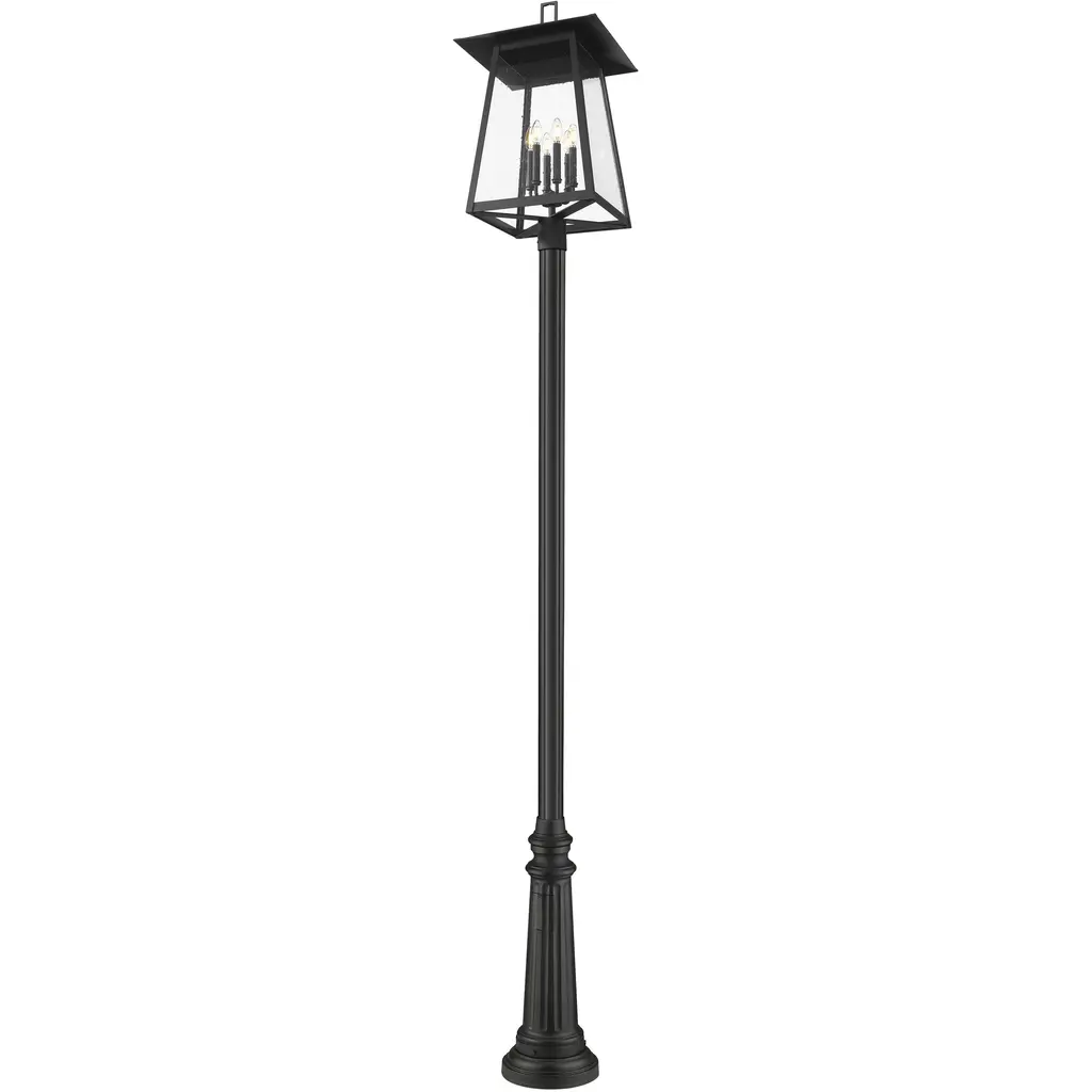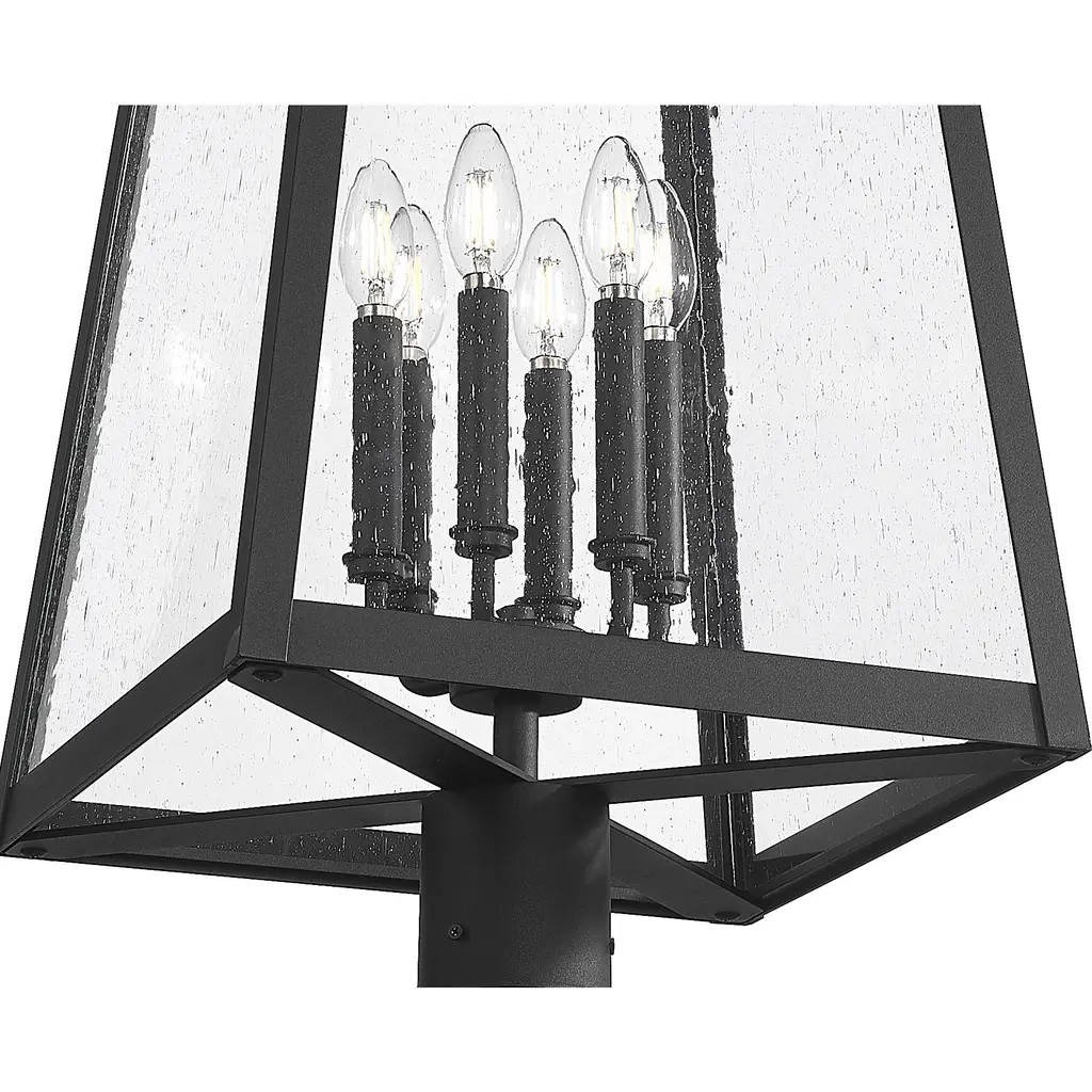 Illuminate a custom exterior space with romance as this six-light outdoor post-mounted fixture enhances front or back landscaping. Its gently contoured pole silhouette and lantern motif showcase black finish aluminum, creating a smooth look and feel. The lantern is enhanced with clear seedy glass panels and a candelabra light mount that combine to deliver a touch of vintage character to your exterior.