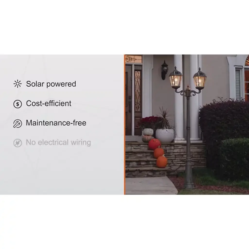 The Royal Bulb Solar Outdoor 2-Light Post Lamp from Gama Sonic offers an eco-friendly and cost-effective alternative to outdated electric or gas-powered outdoor lighting. Its design, reminiscent of New Orleans streetlamps, introduces a touch of elegance and uniqueness to any location. This lamp post is constructed from durable, rust-resistant cast aluminum with a powder-coated, weathered finish. Integrated solar panels on the lighting fixture charge an internal Lithium Ion battery pack during daylight hours. As evening approaches, seven bright-white LEDs within each lamp head automatically activate, emitting a warm glow through the beveled glass panes at a temperature of 120 lumens when fully charged. This fixture is designed for dusk-to-dawn operation, ensuring consistent illumination throughout the night. If the solar panels don't receive sufficient direct sunlight for a full battery charge, you can switch the LED brightness mode to low, prolonging the duration of nightly lighting.