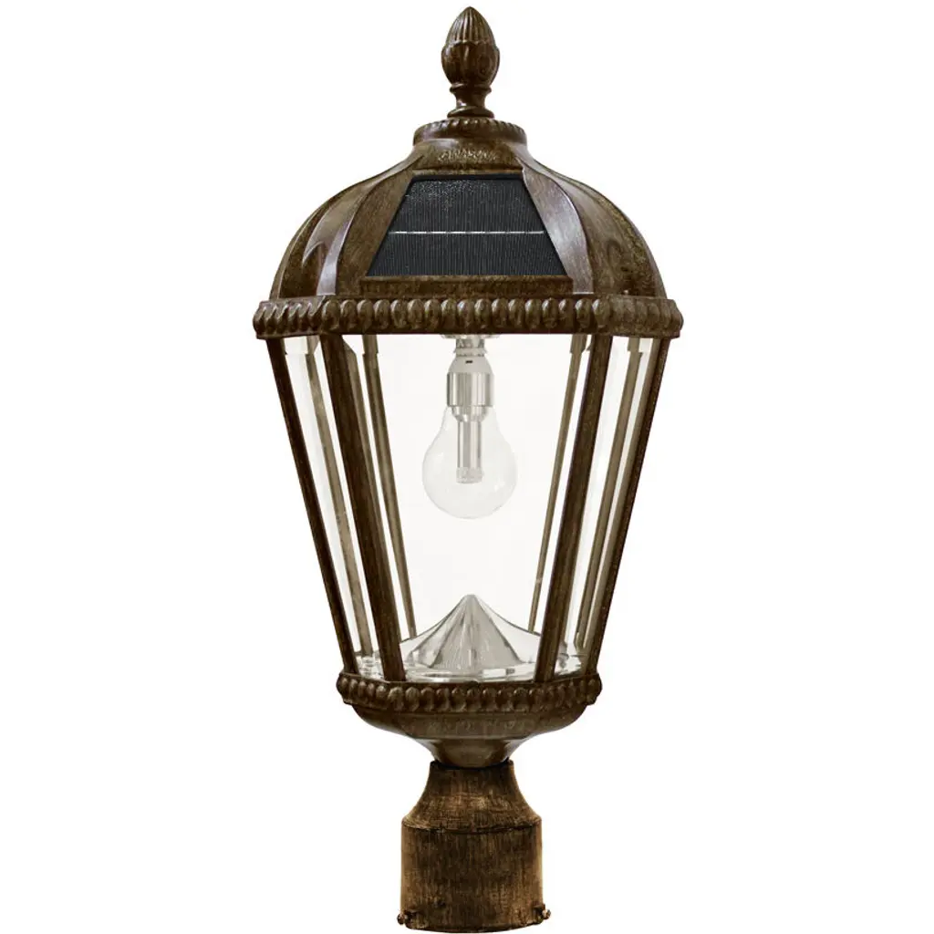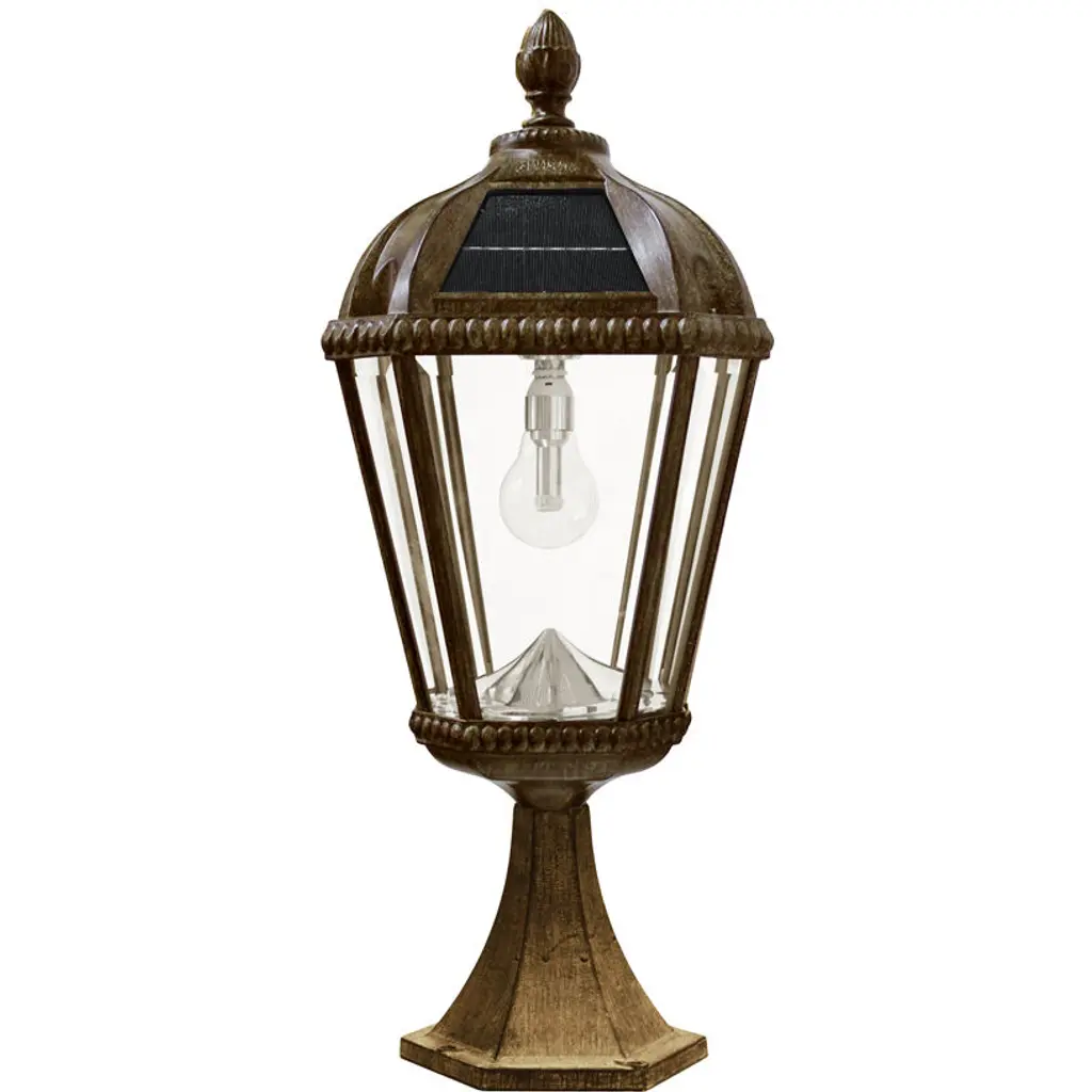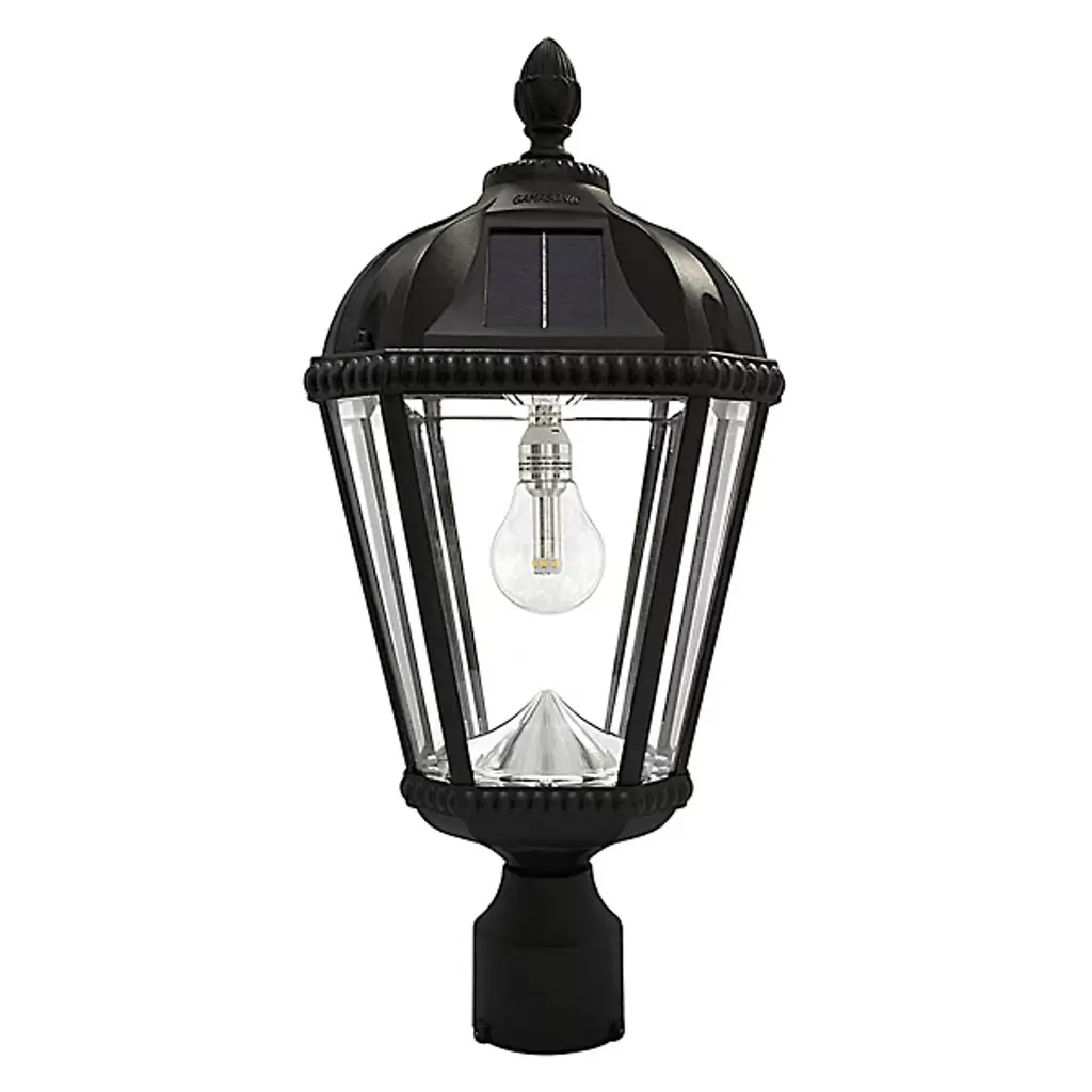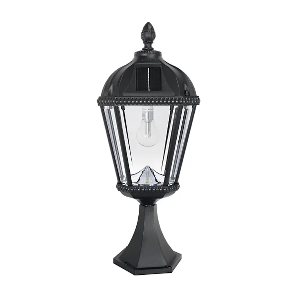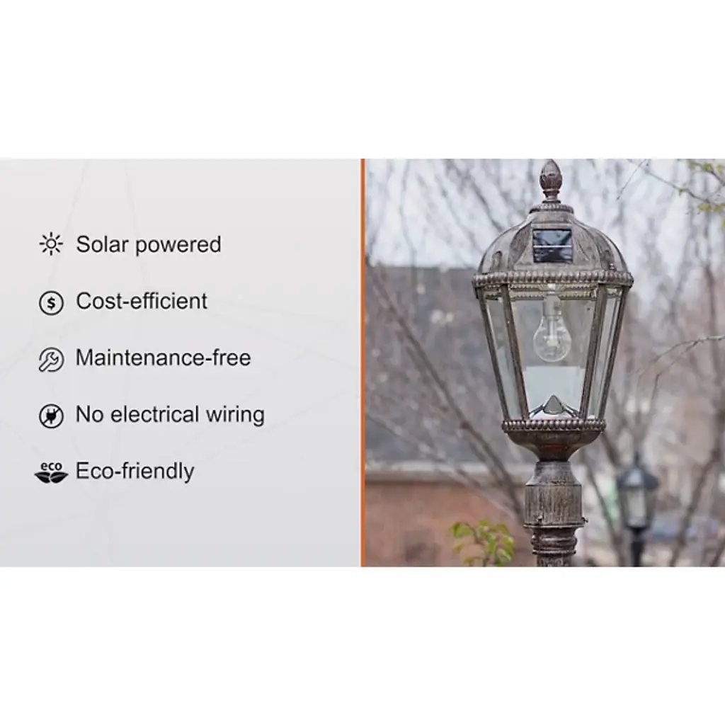 The Royal Bulb Solar Outdoor Post Light from Gama Sonic is a solar-powered pier mount lamp designed with inspiration from the charming architecture of New Orleans. This stylish, user-friendly fixture is an excellent eco-friendly alternative to traditional electric or gas-powered outdoor lighting. Crafted from weather-resistant and rust-resistant cast aluminum with powder-coated, weathered, and beveled glass panes, this outdoor solar pier lamp is built to withstand the elements. It incorporates advanced GS solar LED light bulb technology, providing 360-degree illumination. As dusk falls, it automatically switches on, emitting a warm white light at 120 lumens (2700K) for up to 12 hours on a full charge.