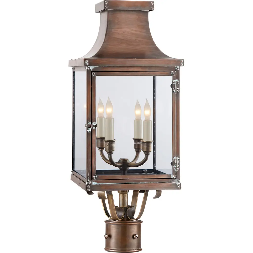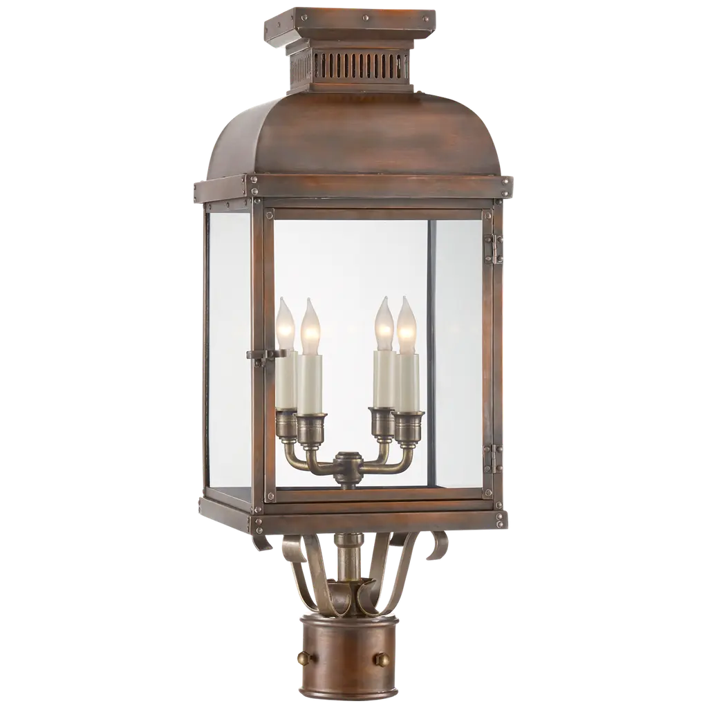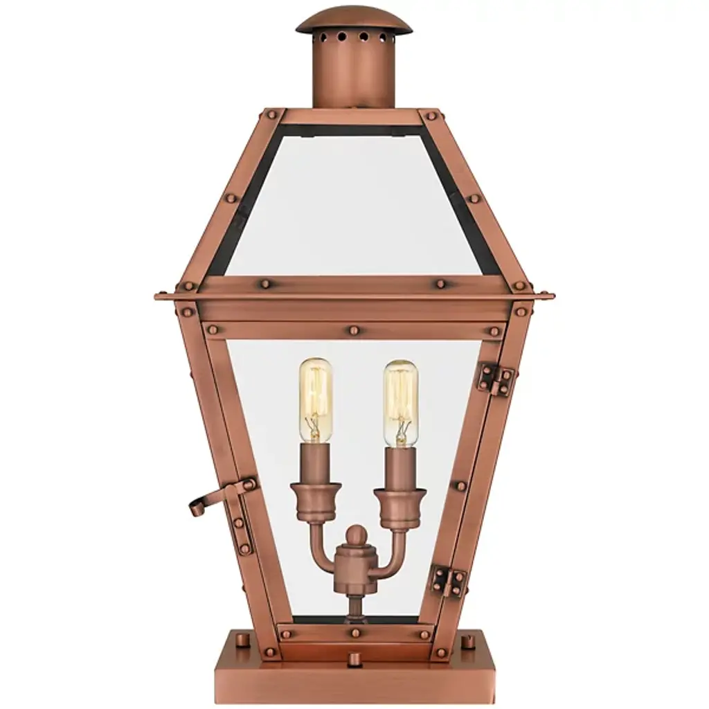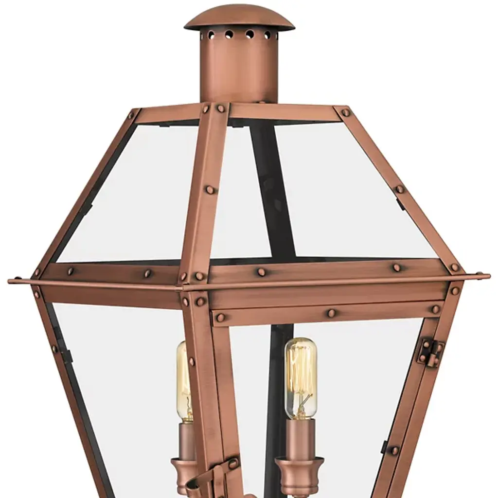 Meet the Rue De Royal Outdoor Post Light, a vintage blend of historic charm and modern convenience from Quoizel's Charleston Copper & Brass Lantern Collection. This outdoor lantern replicates the nostalgic look of gas lighting but operates entirely on electricity and is crafted with a hand-riveted metal frame, exuding a romantic allure reminiscent of antique lanterns while boasting energy-efficient functionality, setting wet-listed lamping behind clear tempered glass shades. The industrial finish enhances its antique appeal, adding a welcome touch of rustic elegance while evoking the ambiance of the French countryside. The post is sold separately.