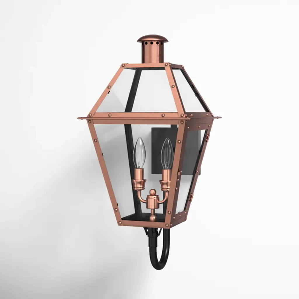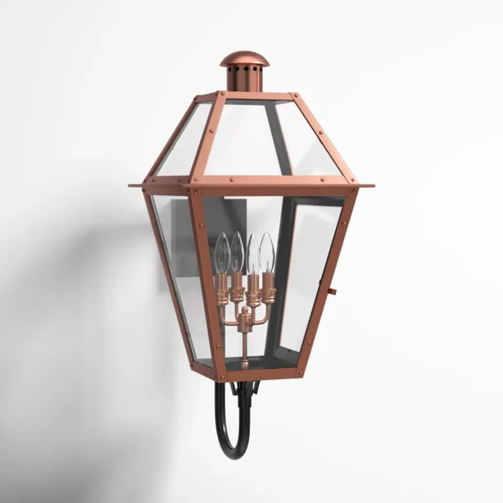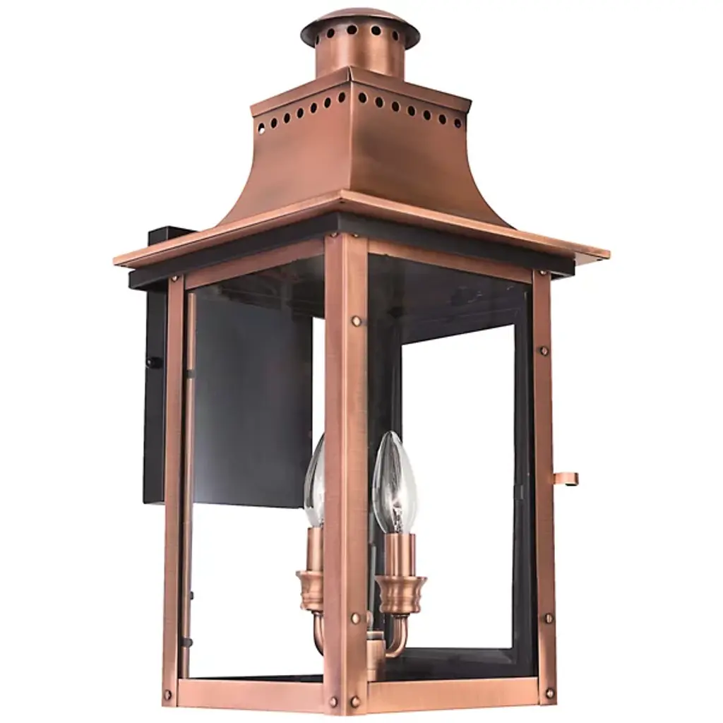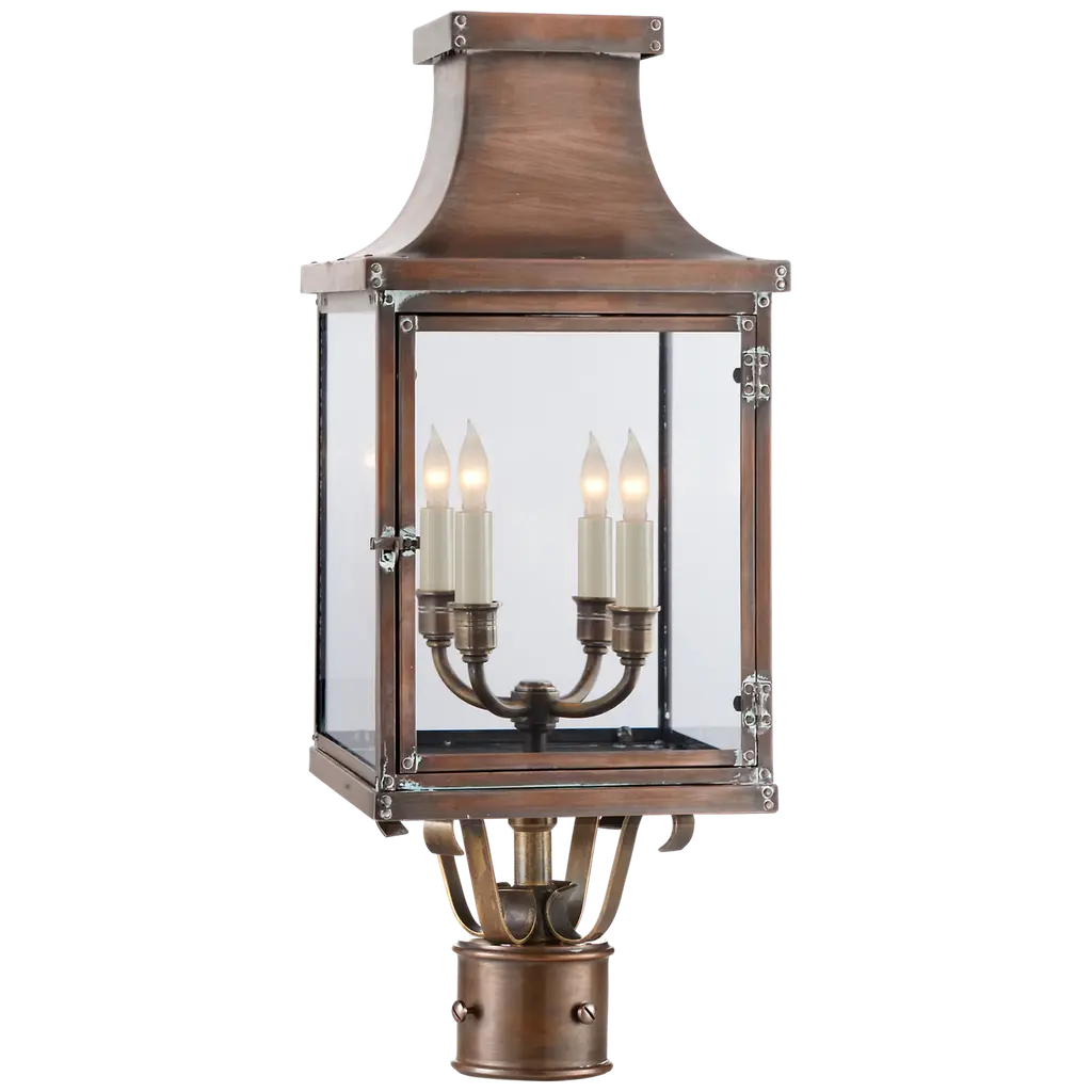 Meet the Rue De Royal Outdoor Post Light, a vintage blend of historic charm and modern convenience from Quoizel's Charleston Copper & Brass Lantern Collection. This outdoor lantern replicates the nostalgic look of gas lighting but operates entirely on electricity and is crafted with a hand-riveted metal frame, exuding a romantic allure reminiscent of antique lanterns while boasting energy-efficient functionality, setting wet-listed lamping behind clear tempered glass shades. The industrial finish enhances its antique appeal, adding a welcome touch of rustic elegance while evoking the ambiance of the French countryside. The post is sold separately.