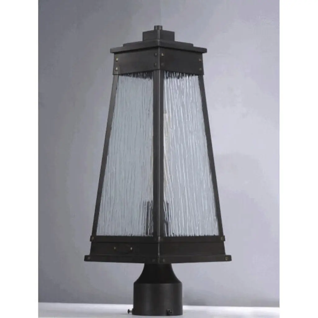 A tapered square shade finished in Olde Brass suspends from a bracket to replicate a nautical lantern. Panels of clear Ripple glass allow for the lamp to shine through while still diffusing the light. The medallion at the base of the shade and rivets along the frame are finished in an antique brass to add authenticity to the design.
