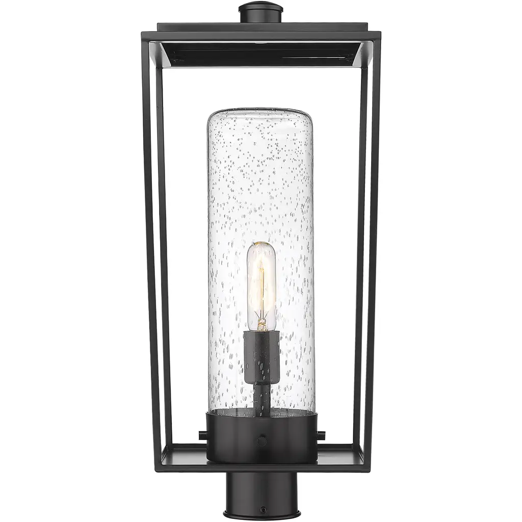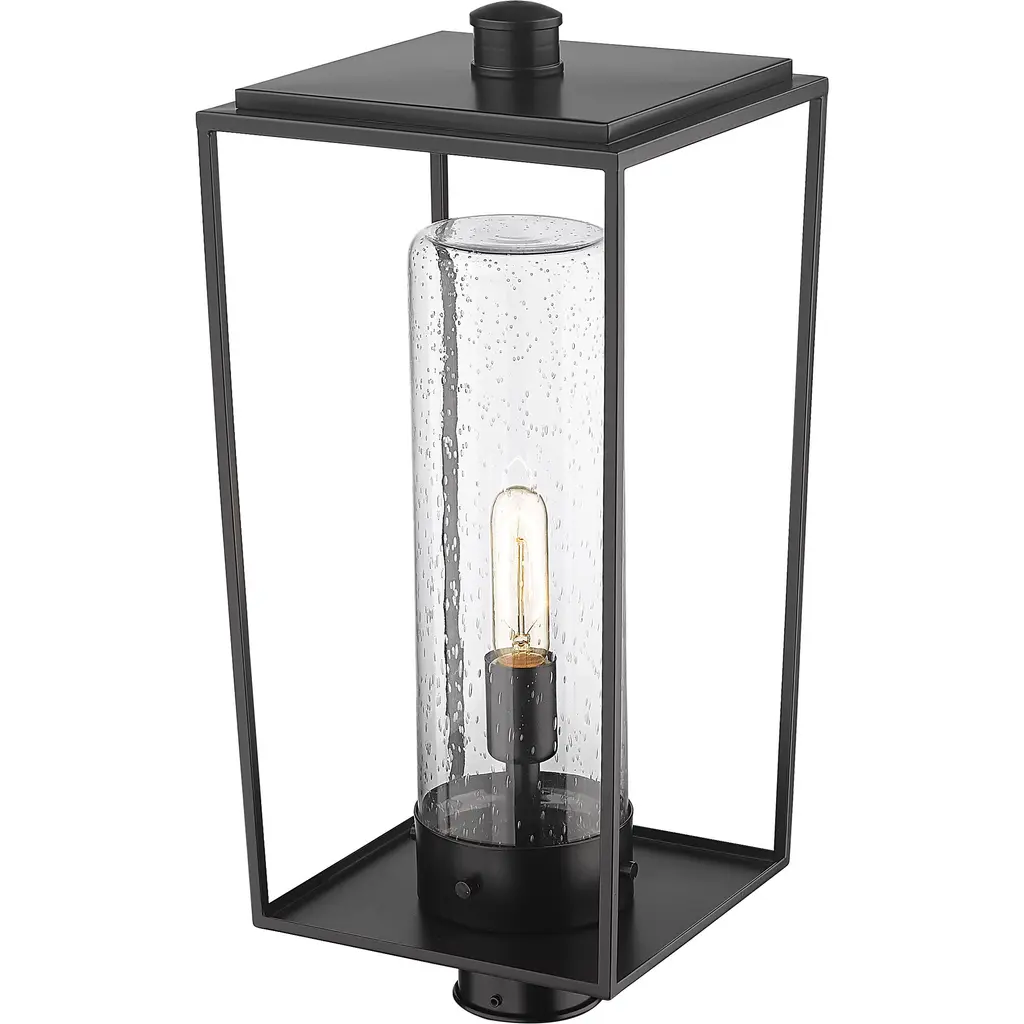 The Sheridan outdoor post mount fixture offers illumination from a single light source and tops a new or existing post created to embellish a custom exterior space. With a village-like charming lantern motif, this light offers a black finish aluminum & steel open box frame with a seedy glass cylinder shade. The combination of aesthetics joins weather-resistant materials to fashion a compelling fixture to add to outdoor spaces.