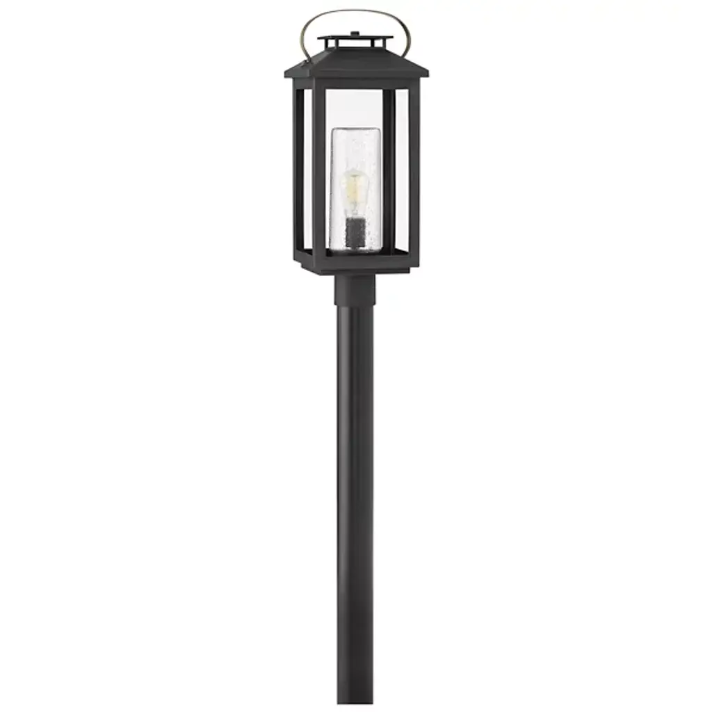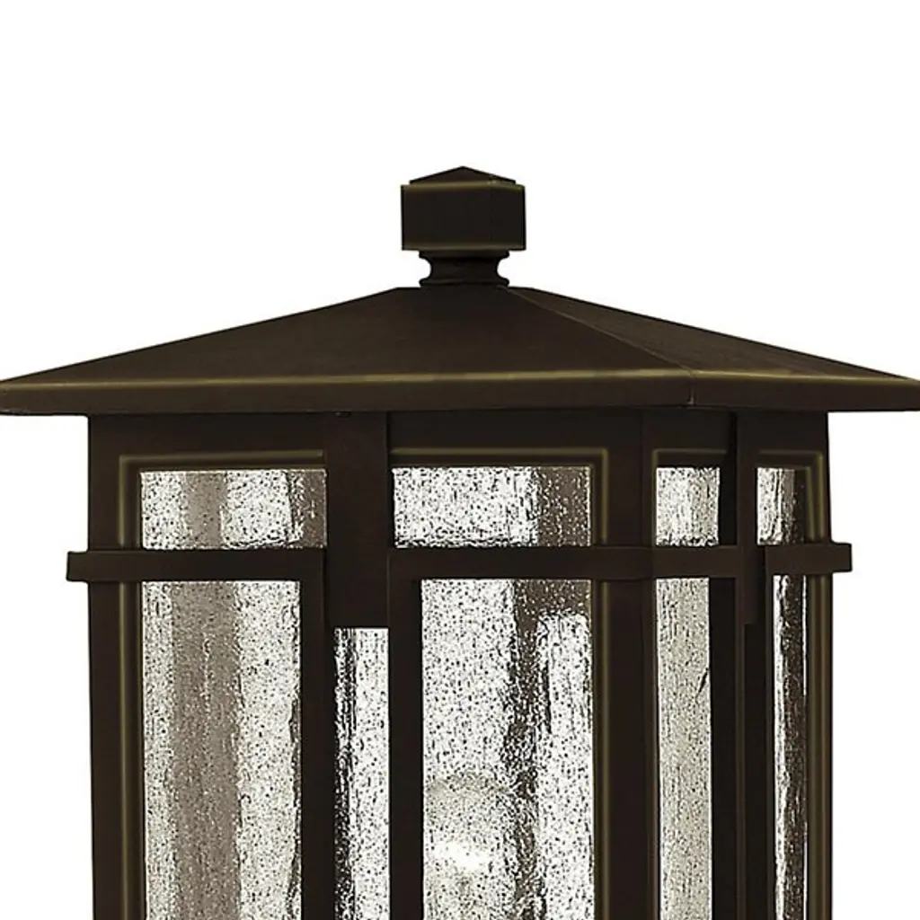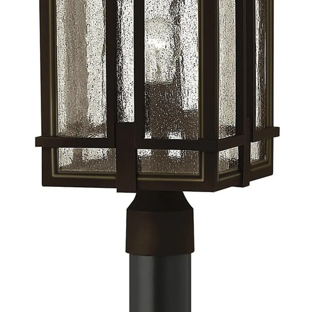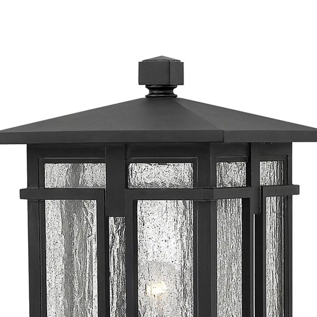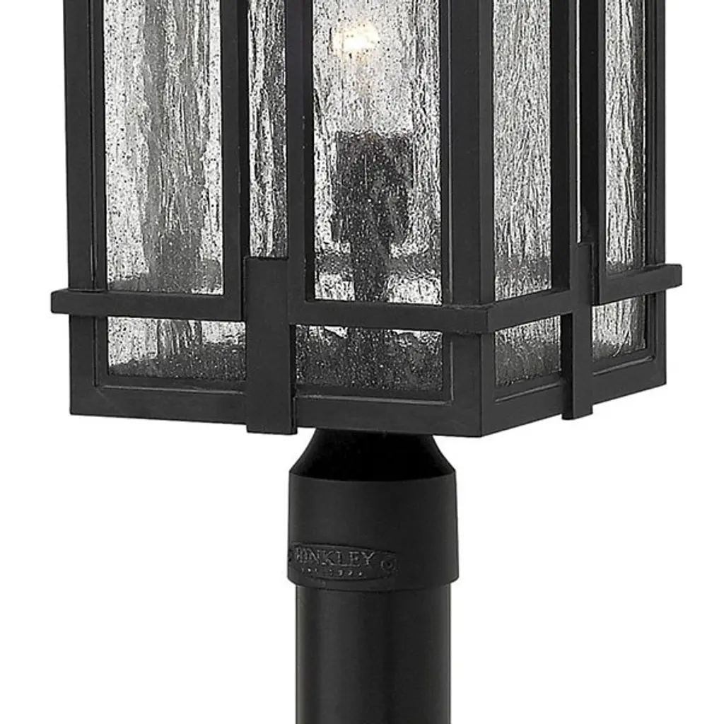 The Tucker Outdoor Post Light from Hinkley Lighting is a piece crafted with modern production processes in a design calling back to traditional lanterns. As a transitional design, this post light serves as a natural fit with a range of home styles. It stands proudly over the post in a solid aluminum structure designed to stay strong throughout the seasons. This structure gives a nod to the familiar lantern with a tapered hood and caged design. This cage features a bevy of lines that create a graphic silhouette. Seeded glass panels mellow these lines and the bright light with vintage texture. The diffused light creates a golden display and an alluring atmosphere.