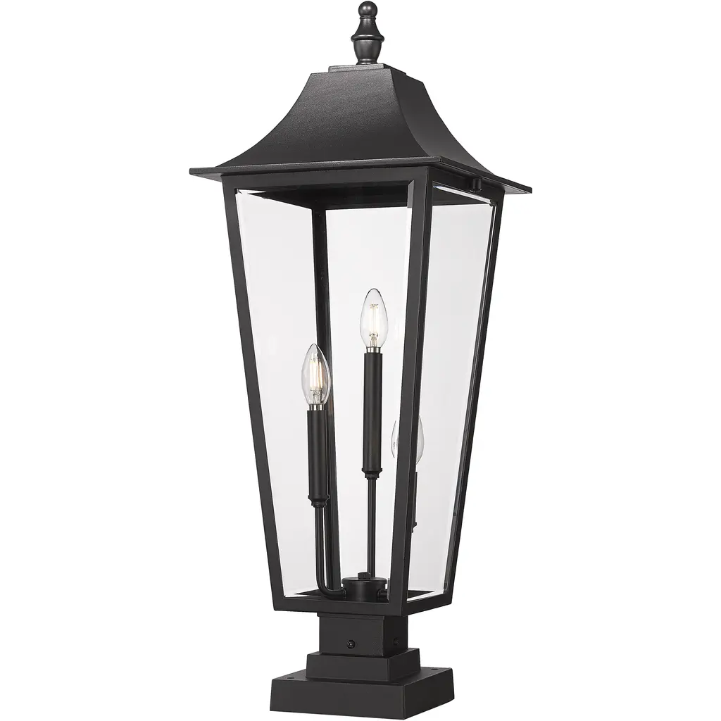 Inspired by classic coach gas lanterns, the Vicksburg collection features die-cast aluminum construction finished in Black with Clear glass. The candle sleeves are done in a contrasting off-white finish to add dimension to the lantern. Available in numerous sizes and configurations including a handsome pocket wall.