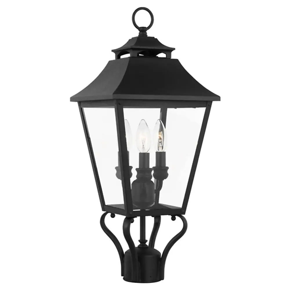 The Wellsworth 3-Light Outdoor Post Light by Visual Comfort Studio, formerly known as Sean Lavin, is a fusion of nautical nuances and traditional elements. Its tall, cast aluminum frame is resistant to rust making it an ideal choice for outdoor lighting while its sleek handle is reminiscent of vintage lanterns. This post light features seeded glass panels on all sides that house a series of candelabra lamps, producing a warm, welcoming ambiance ideal for entryways, patios, and porches.