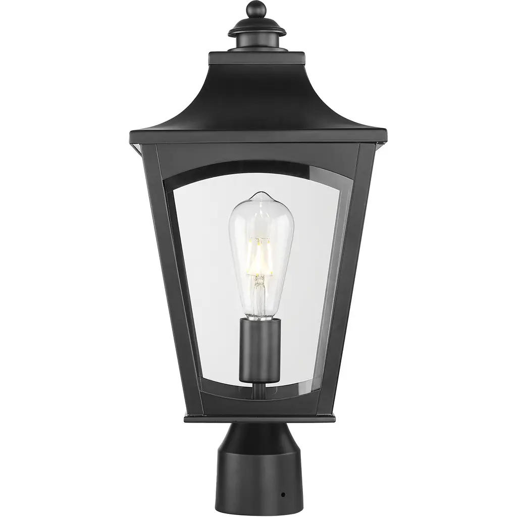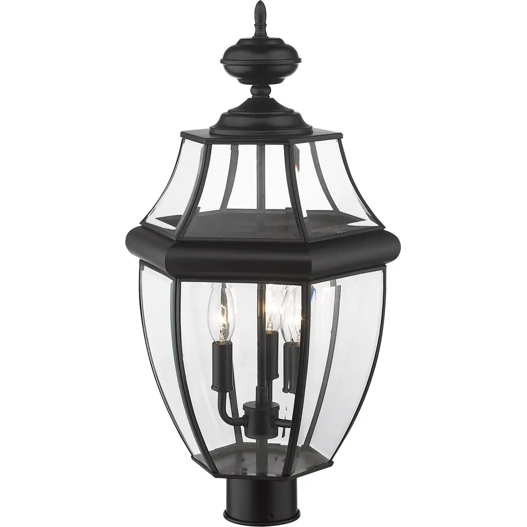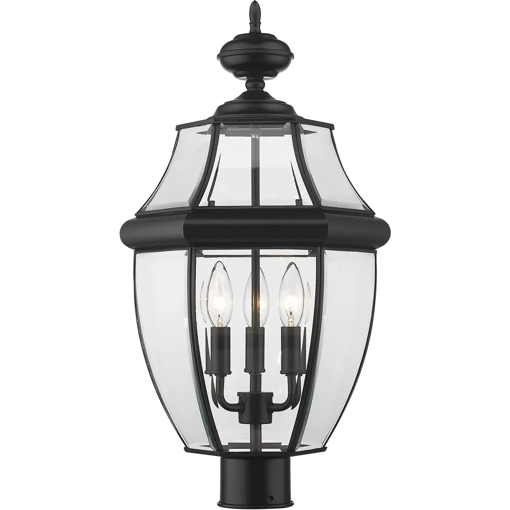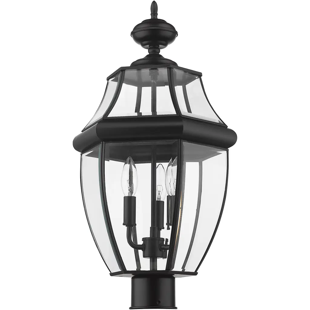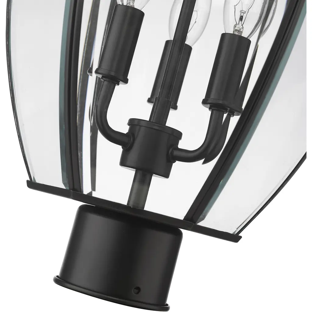 This three-light outdoor post mount fixture adds a traditional silhouette to the lighting in your patio, deck or other outdoor area. With its candelabra composition, the lamp provides soft, effective illumination. A multi-sided clear beveled glass shade has a black steel frame, creating an elegant impression.
